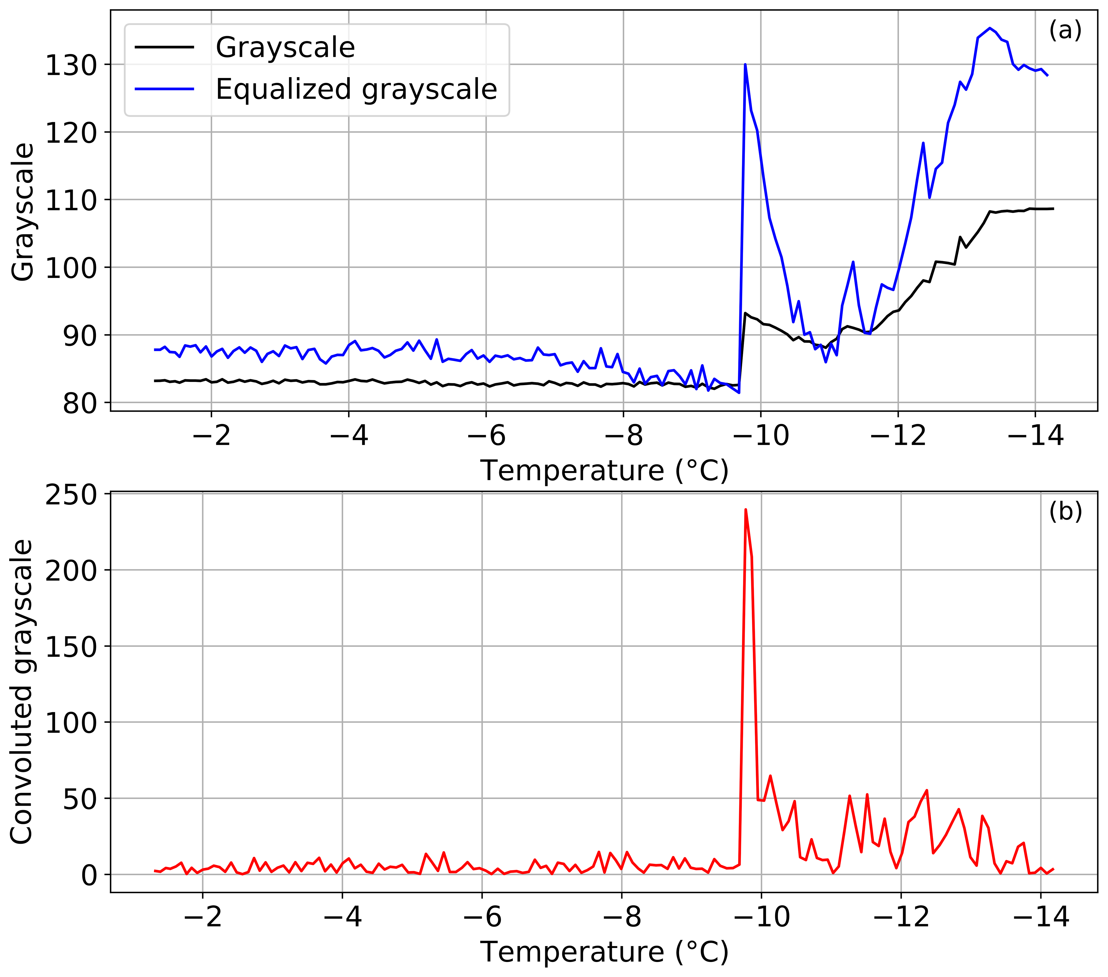 Figure 2(a) Evolution of the grayscale (black line) and the equalized grayscale (blue line) of a well with decreasing temperature in a typical experiment. (b) Convoluted grayscale, where the peak marks the freezing of the well.