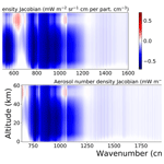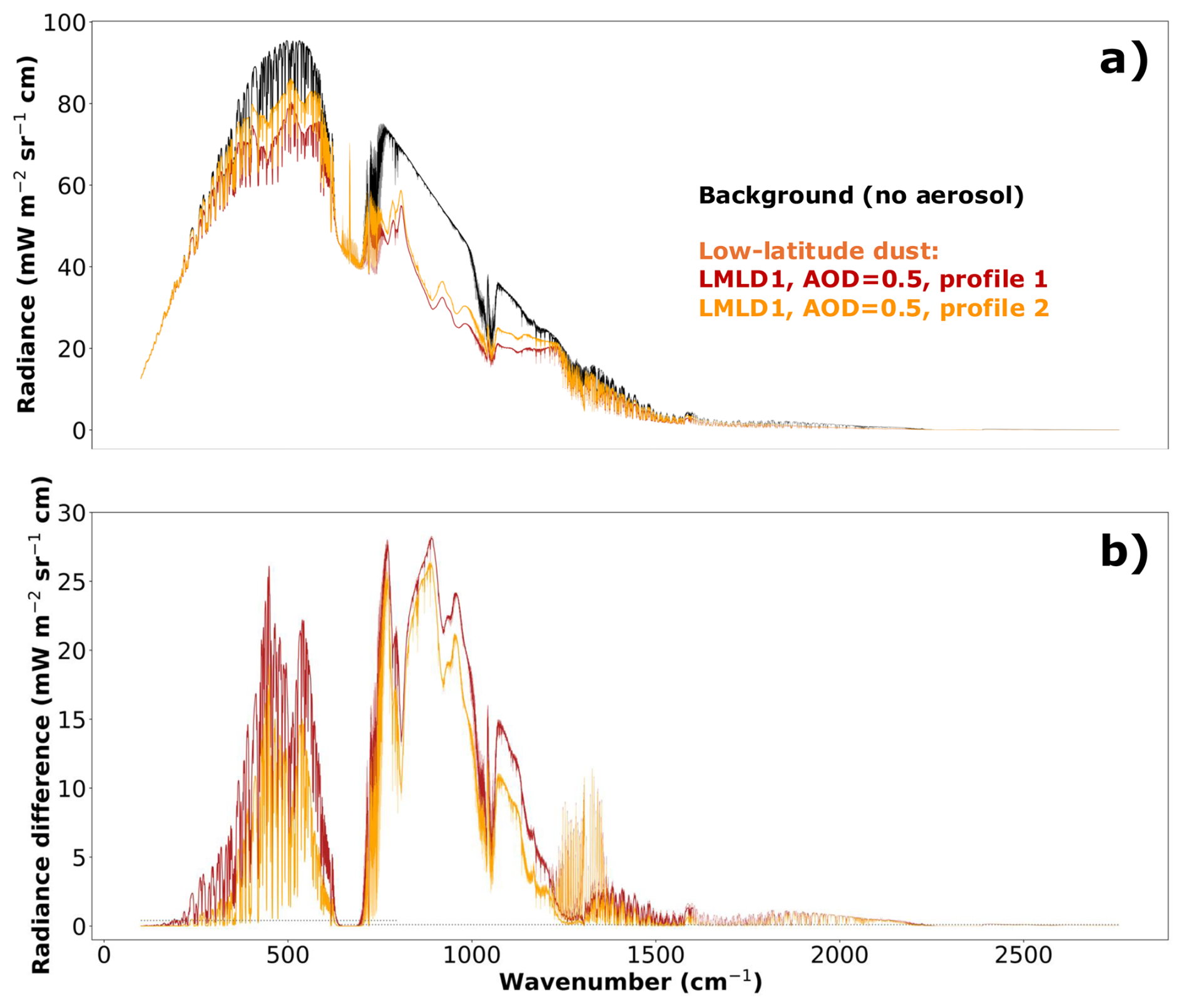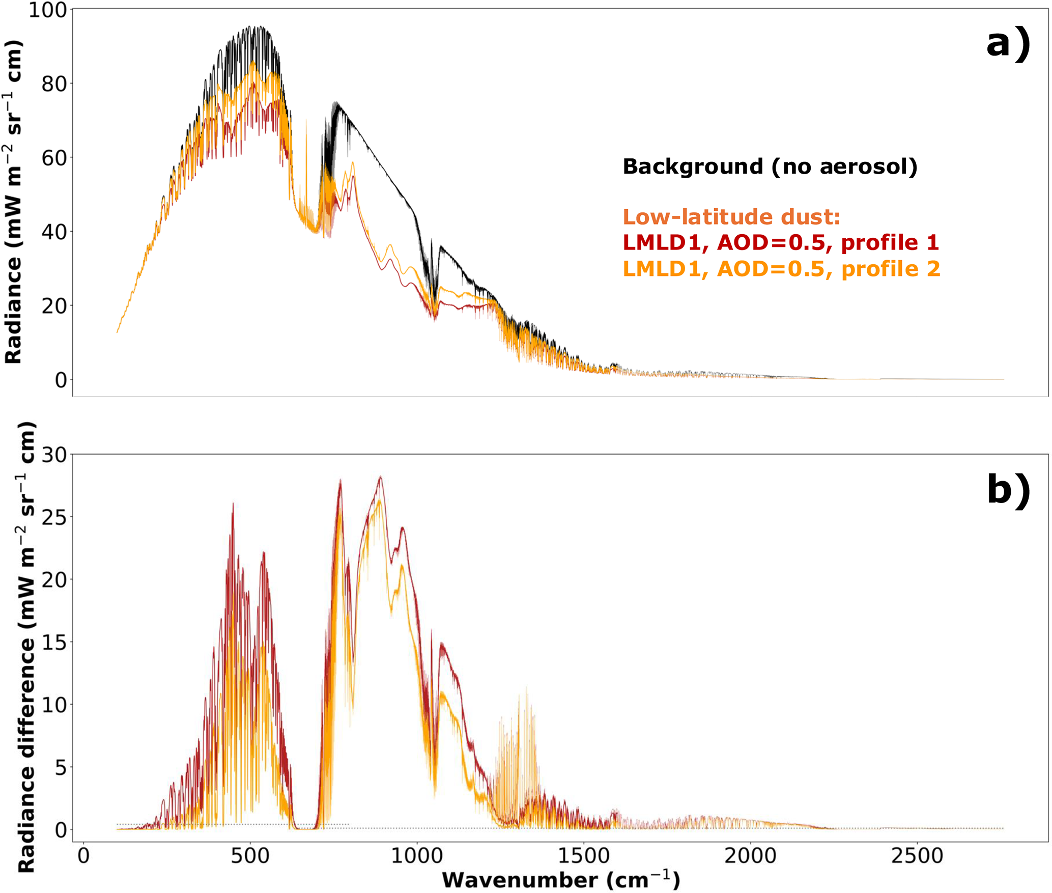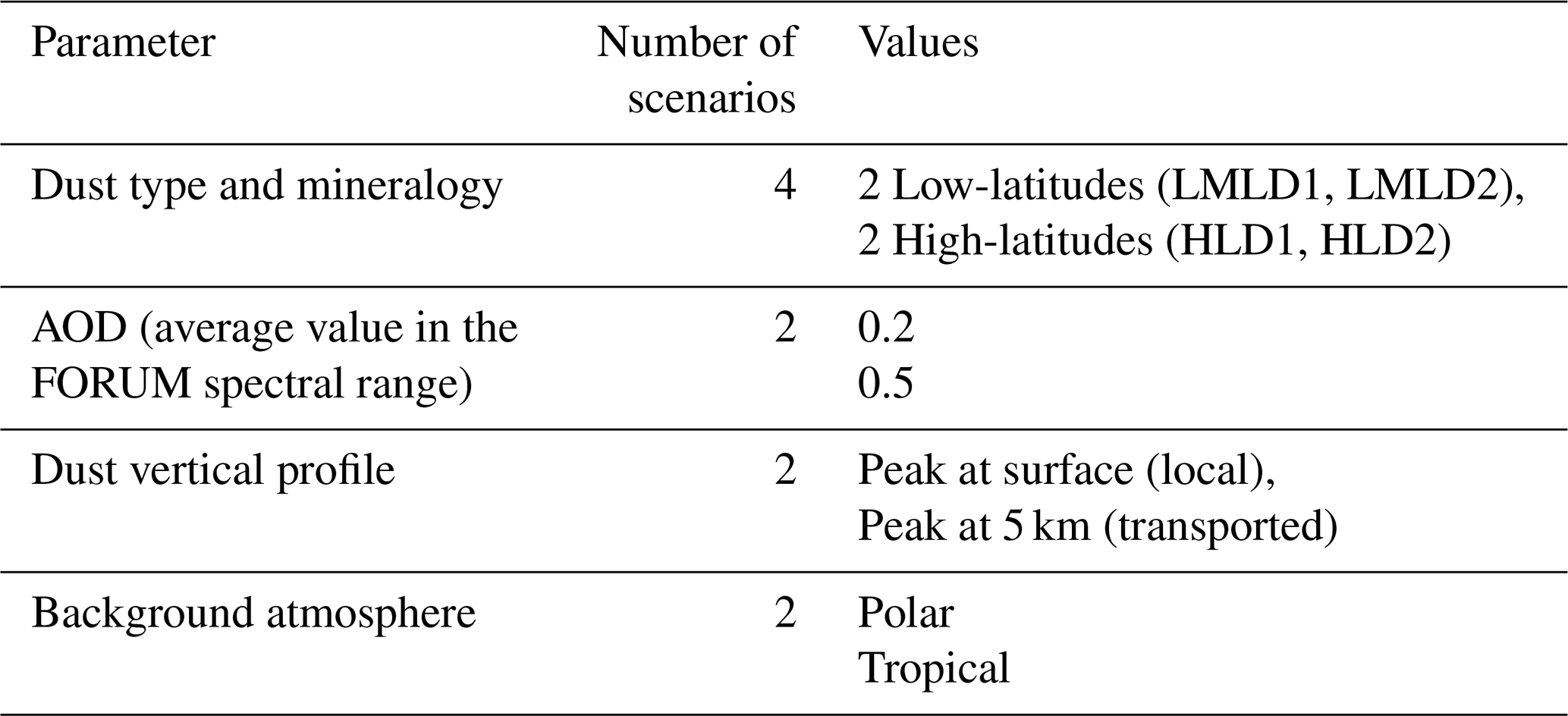 The outputs of the PO simulator are the FORUM and IASI-NG spectral radiance POs R(ν) (where ν is the wavenumber), for background atmospheres and for atmospheres with dust layers. In case of dust presence, we consider different scenarios, summarised in Table 1. Based on polar or tropical background atmosphere, we vary the dust type (LMLD or HLD) its mineralogy, its burden in terms of AOD and its vertical profile distribution. In addition, to get more insights into the sensitivity of the PO spectra, we also compute the Jacobian matrices K(ν,z) (where z is the altitude) for each experiment and for the two instruments, i.e. the partial derivative of the radiance spectra R(ν) with respect to the dust number distribution N(z):