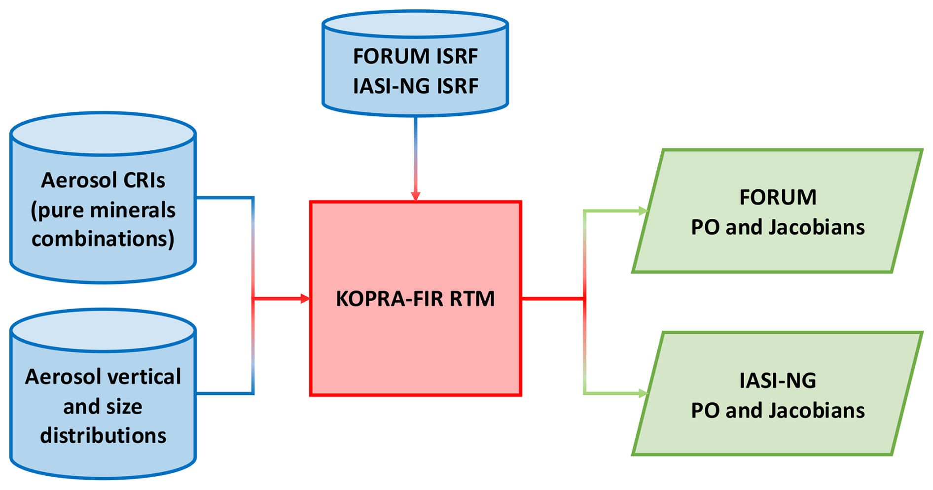 This analysis is carried out using a set of spectral radiance pseudo-observations (PO), i.e. synthetic observations of the outgoing infrared spectra, generated with the PO simulator based on the conceptual scheme shown in Fig. 1. We simulate spectral observations of FORUM and IASI-NG, so to compare the dust sensitivity in the FIR (provided by FORUM PO) with the one in the MIR (provided by IASI-NG PO).