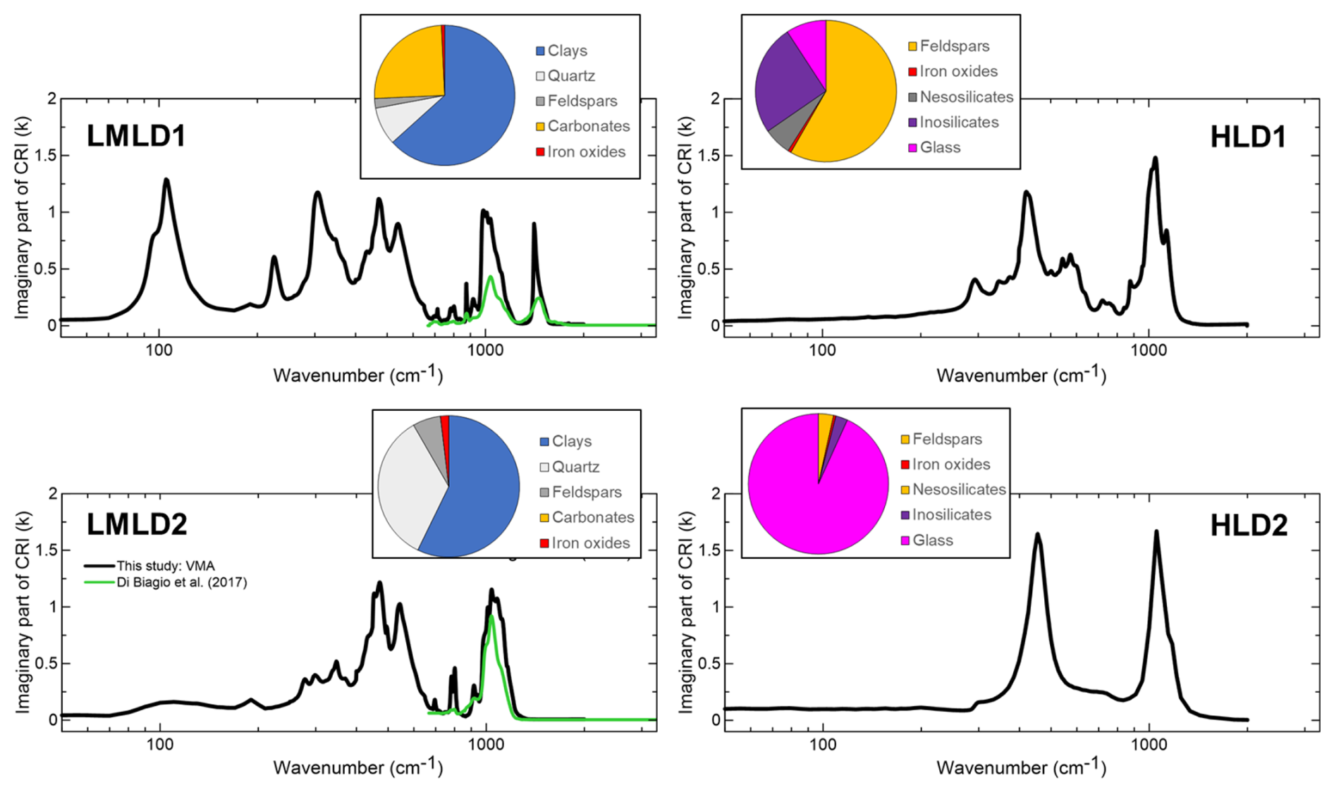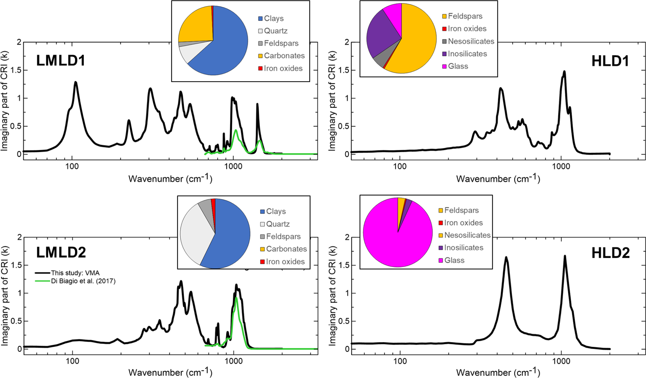 Figure 2The spectral imaginary part of the complex refractive indices calculated using the VMA method (in black) compared with the experimental measurements from Di Biagio et al. (2017) for LMLD1 and LMLD2 (in green). The mineralogical composition (% in volume) of the four dust samples is also shown in the inlets. The spectral data for the real part of the CRI are shown in Fig. S2.