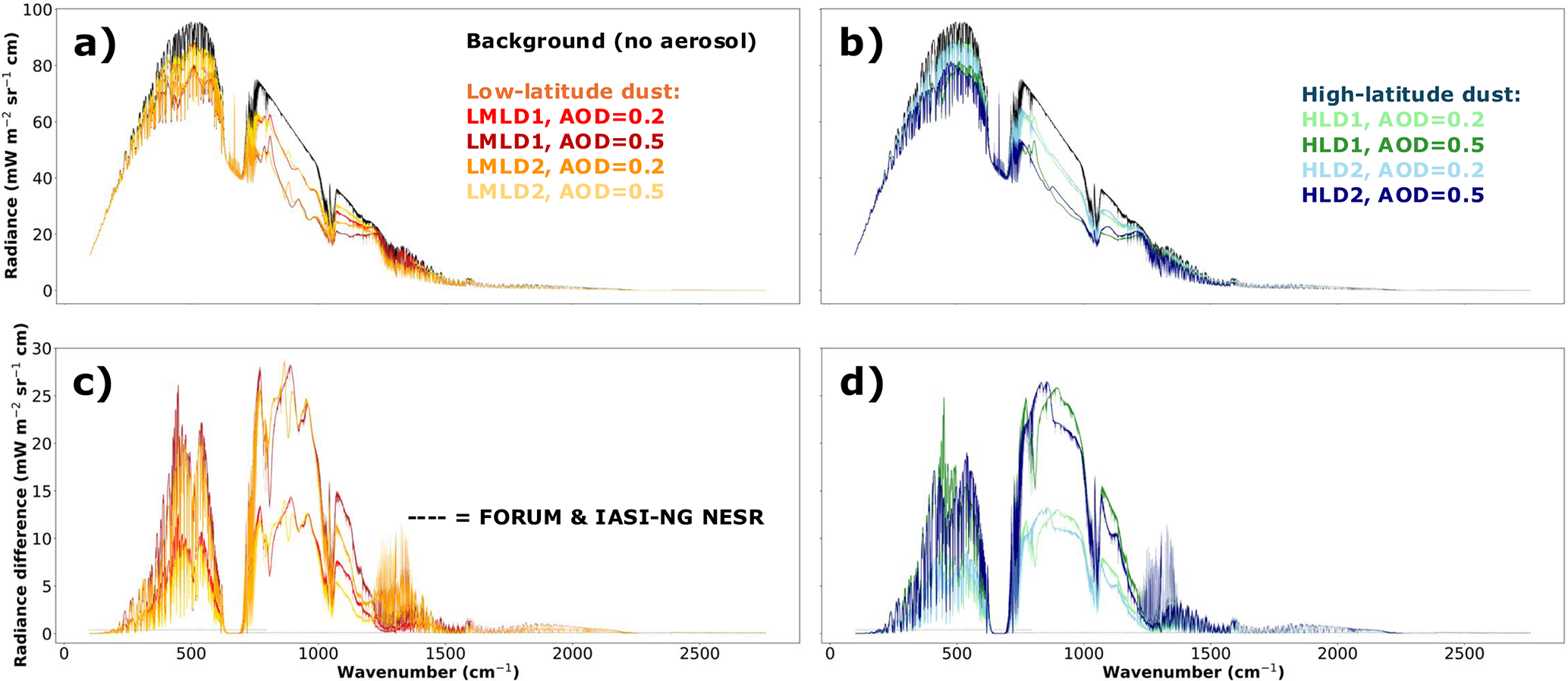 As a first experiment, we analyse the scenarios with both LMLD and HLD in a polar atmosphere, with a dust vertical profile peaking at 5 km altitude. This configuration is intended to represent cases of different types of dust uplifted and possibly transported towards the poles. On the one hand, poleward transport represents an established pathway for LMLD injections at high altitudes, in link to episodes of emissions over major desert source regions coupled with vertical transport due to strong convection (e.g. Zhao et al., 2006, 2022). On the other hand, this configuration can be associated with a larger FIR sensitivity to dust than at tropics due to a dryer atmosphere and a higher altitude of the dust layer. Figure 3a, b show FORUM and IASI-NG PO spectra for the four dust types and the two AOD values, at these conditions, as well as PO spectra with a background atmosphere. These latter are defined as PO spectra obtained with the same atmospheric and instrumental configurations but without any dust layer, and are used as a baseline reference spectrum. Figure 3c, d show the spectral signatures of the four dust types and two AOD values, defined as the difference of the background and the dust-laden FORUM and IASI-NG PO. One notable aspect of the FORUM PO and, more in general, FIR spectral signatures is that they are, as expected, strongly affected by water vapour absorption lines. This is one marked difference with respect to IASI-NG PO and MIR signatures. The very large sensitivity of FORUM observations, and FIR observations more in general, to water vapour is discussed by Palchetti et al. (2020) and its implications will be further discussed for our FORUM PO in Sect. 3.3. Despite this, for these atmospheric and dust configurations, Fig. 3 shows that the magnitude of the impacts of dust on infrared PO spectra is comparable in the FIR and the MIR, reaching, in both cases, peak signatures around 10–25 mW m−2 sr−1 cm−1 depending on the AOD. The spectral signatures of these dust layers on the FORUM and IASI-NG are up to two orders of magnitudes larger than FORUM and IASI-NG radiometric noise. This latter is represented as the FORUM and IASI-NG noise equivalent spectral radiance (NESR), set as values of 0.4 and 0.1 mW m−2 sr−1 cm−1, for FORUM and IASI-NG, respectively. It is well known that dust exhibits distinct spectral features in the MIR range, which have been used in the past for its detection and characterisation with instruments such as IASI (e.g. Cuesta et al., 2015; Capelle et al., 2018; Clarisse et al., 2019). The simulations in this study show additionally a clear FIR spectral signature of dust in the Earth's atmosphere. Despite a comparable spectral radiance signature in the MIR and the FIR, Fig. 3 suggests that the FIR is slightly less sensitive than the MIR to the dust type (mineralogy). Both the FIR and the MIR spectral signatures vary considerably with the AOD, and then the dust burden (2 to 3 times larger signatures for AOD = 0.5 than 0.2, in this case).