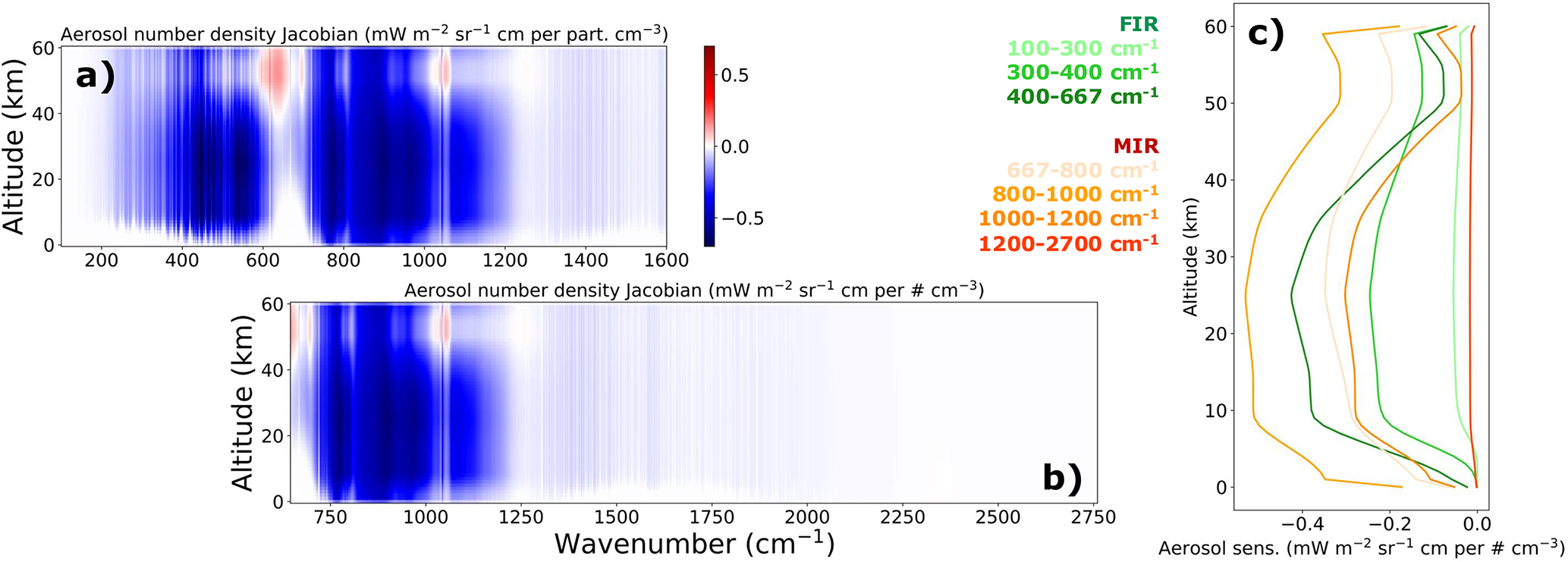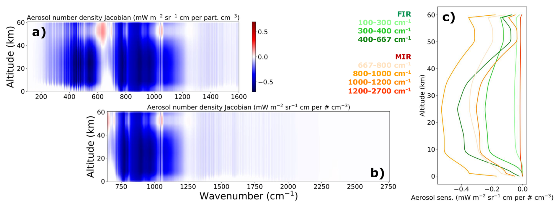 Figure 5FORUM (a) and IASI-NG (b) Jacobians K(νz) with respect to the aerosol number density, for the case of Australia dust sample, with a FIR AOD = 0.2, a vertical profile peaking at 5 km altitude, in a polar atmosphere. Average aerosol sensitivity, quantified through the average Jacobians at different FIR (curves in green shades) and MIR sub-regions (curves in yellow-red shades) (c). Specific spectral intervals of these sub-regions are listed in the figure, with colours corresponding to those of the curves in panel (c). The spectral aerosol sensitivity is estimated using FORUM Jacobians, for the FIR, and IASI-NG Jacobians, for the MIR.