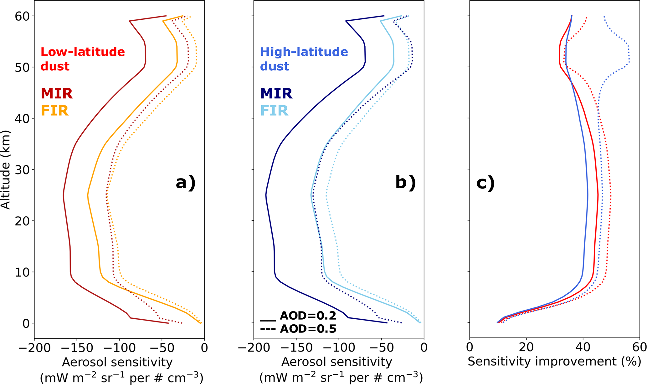 Figure 6Aerosol sensitivity integrated in the sensitive FIR (300–667 cm−1) and MIR (800–1200 cm−1) spectral regions, for a low-latitude (LMLD2, a) and a high-latitude (HLD1, b) dust sample. The FIR sensitivity is represented by yellow (a) and light blue (b), and the MIR sensitivity is represented by red (a) and dark blue (b) curves. In both panels (a) and (b), scenarios with AOD = 0.2 and 0.5 are represented as solid and dotted lines, respectively. The sensitivity improvement for the four scenarios is in panel (c): red and blue curves are for low- and high-latitude dust, solid and dotted lines for AOD = 0.2 and 0.5 respectively. All scenarios are for a dust layer peaking at 5 km altitude and for a polar background atmosphere.