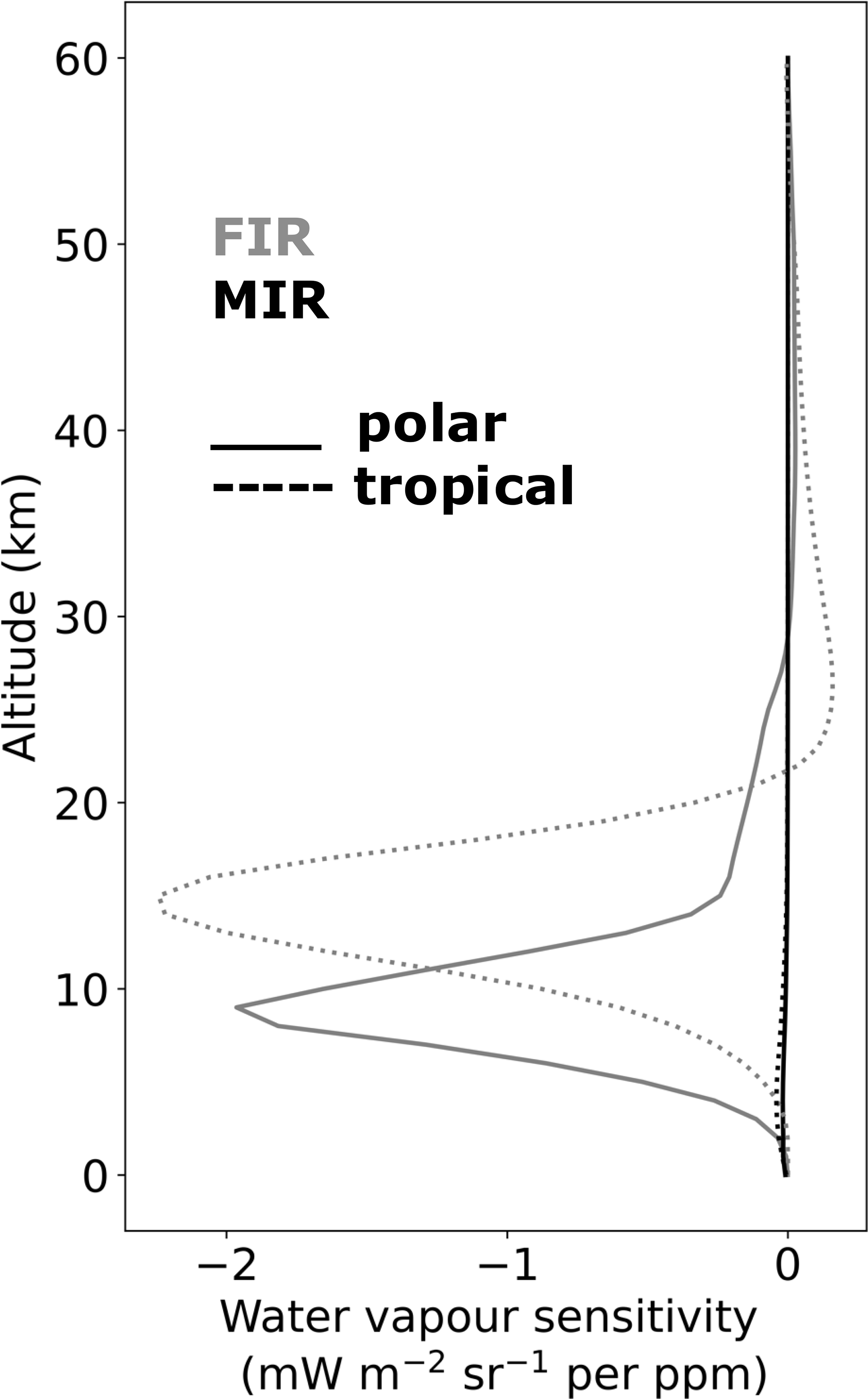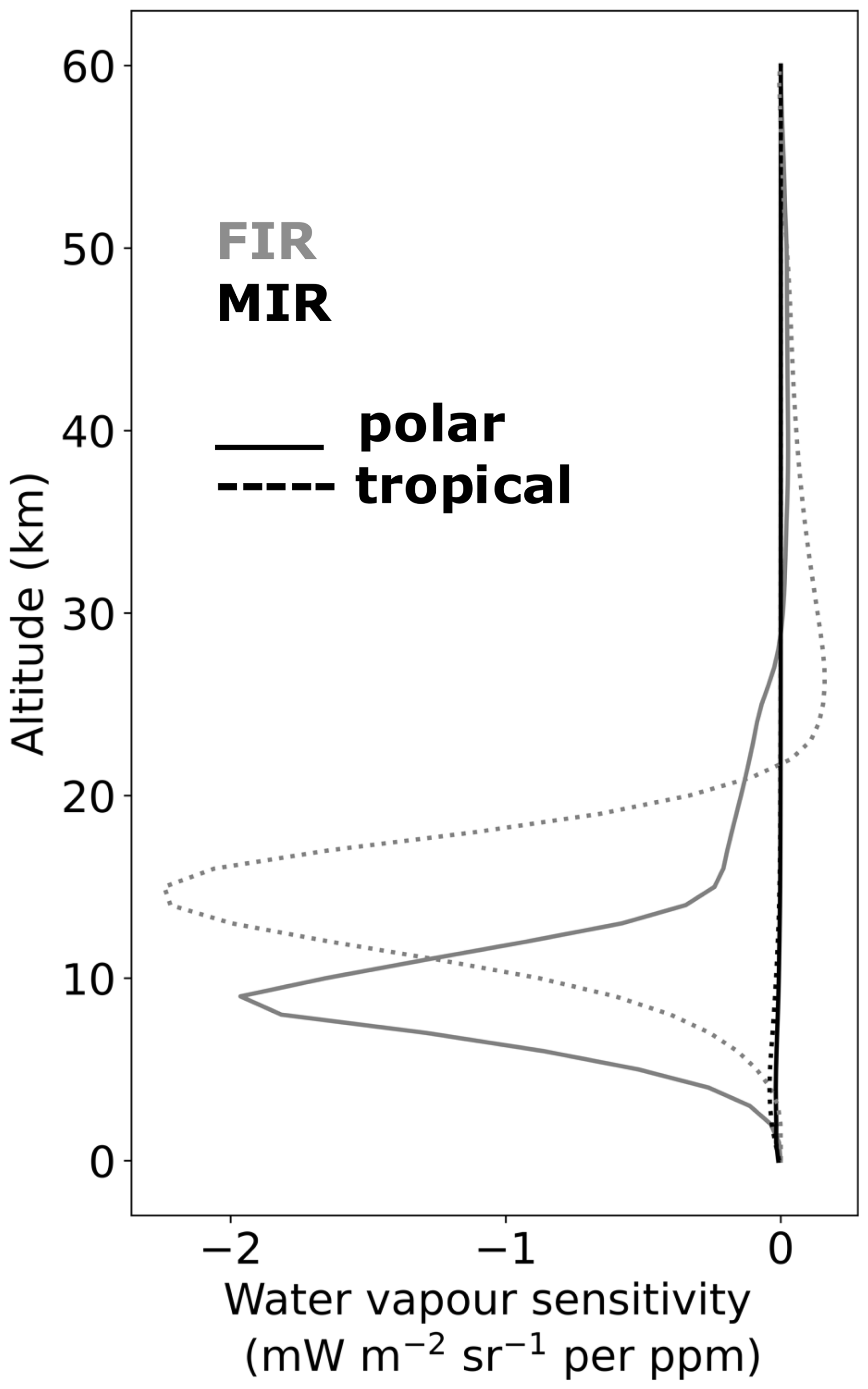 Even if Fig. 6 suggests a comparable sensitivity to dust in the FIR and the MIR, with the FIR contributing up to 50 % to the overall infrared sensitivity to dust (Fig. 6c), it is important to also consider the possible interferences of the spectral sensitivities to other atmospheric parameters. In particular, it is worth evaluating if water vapour significanly masks the FIR sensitivity to dust, especially in the more humid background tropical atmosphere. Water vapour has a much larger impact on the FIR spectra than in the MIR, which renders the water vapour observation one primary target of the FORUM mission (e.g. Palchetti et al., 2020). The large impact of the absorption lines of water vapour to the FORUM PO is clearly visible e.g. in Figs. 3 and 4. To evaluate the relative sensitivity of FORUM PO, and FIR spectral observations in general, to water vapour and dust, we calculated the total sensitivity of FIR and MIR spectra to water vapour (in mW m−2 sr−1 per unit water vapour mixing ratio, in part per millions – ppm), which is shown in Fig. 7. Both polar and tropical atmospheres are considered in the figure. These results are very consistent with what shown by Palchetti et al. (2020, Fig. 6 therein). The water vapour total sensitivity is negligible in the MIR, if compared with FIR. In the FIR, the water vapour sensitivity peaks at about −2 mW m−2 sr−1 ppm−1, at 8–15 km. To compare with the dust total sensitivity in the FIR, shown in Fig. 6a, b, the following consideration must be done. We focus on the regions of larger sensitivity of FIR spectra to dust, so we make the case of two altitudes, one in the free troposphere (FT, about 5 km altitude) and one in the upper troposphere (UT, about 10 km altitude). In the FT, typical water vapour mixing ratios are of the order of 103 ppm, so that 1 ppm represents a 0.1 % perturbation. From Fig. 7, it can be seen that the total FIR sensitivity to water vapour at 5 km does not exceed −1 mW m−2 sr−1 ppm−1, so about −10 mW m−2 sr−1 %−1 change in water vapour. In the same vertical region, number concentrations of dust do not exceed a few particles per cm3; in our dust scenarios, this upper limit is 5 particles cm−3, so that 1 particle cm−3 represents a 20 % perturbation. From Fig. 6a, b, it can be seen that the total FIR sensitivity to dust at 5 km is approximately in the range between −60 and −80 mW m−2 sr−1 per unit number concentration, so about −3 to −4 mW m−2 sr−1 %−1 change in dust number concentration. At these altitudes, the water vapour sensitivity in the FIR is 2–3 times larger than the dust sensitivity. Higher, in the UT, with similar considerations, we obtain about −2 mW m−2 sr−1 %−1 change in water vapour (typical mixing ratios of the order of 102 ppm and total FIR sensitivity not exceeding −2 mW m−2 sr−1 ppm−1) and about −1 to −3 mW m−2 sr−1 %−1 change in dust number concentration (typical number concentrations of 1–2 particles cm−3 and total FIR sensitivity in the range −100 to −120 mW m−2 sr−1 per unit number concentration). At these altitudes, the dust and water vapour sensitivity in the FIR are comparable or the dust sensitivity can be larger, at certain conditions. Thus, in general, while in the lower troposphere the dust sensitivity is expected to fade due to the effect of water vapour, in the FT and UT the dust sensitivity in the FIR is concurrent with the water vapour sensitivity. This reinforces the previous results, suggesting a potentially promising added value of the FORUM observations in retrieving information on the high-altitude transported dust plumes.
