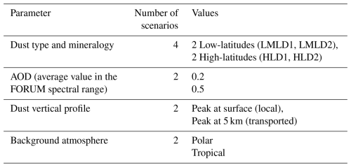 where vi is the volume fraction of each individual mineral composing dust and CRIi is its complex refractive index. The internal mixing hypothesis differs from the real conditions as minerals in dust are externally mixed, except for iron oxides, which may be found as inclusions in clays (Sokolik and Toon, 1999). This hypothesis, combined with the fact that the CRI for single minerals is often not perfectly representative of aerosol particles, leads to a general misprediction of the CRI (e.g., Sadrian et al., 2023). However, the internal mixing hypothesis can represent a mean of evaluating the effect of the variability of composition on dust optical properties especially when those are unknown in a spectral region, as it is the case of the FIR spectral range. In the present analysis, the objective is to test the sensitivity of FORUM observations to dust presence and differences in their characteristics. To this aim, the CRI was calculated considering four different dust mineralogical compositions, including two cases representative of low and mid latitude dust (LMLD), and two cases representative of high latitude dust (HLD). The mineralogical compositions and the spectral imaginary part of the CRI, for the four samples, are shown in Fig. 2. For LMLD the mineralogy of Morocco (referred as LMLD1) and Australia (referred as LMLD2) dust as reported by Di Biagio et al. (2017) are chosen. These two represent contrasted cases, with LMLD1 dust richer in carbonates compared to LMLD2, which has instead a higher iron oxides and quartz content. For HLD, two mineralogical compositions are set being close to the ones reported by Baldo et al. (2020) for two contrasted Icelandic samples, the Iceand-H (Hagavatn) (referred as HLD1) and the Iceland-M (Mýrdalssandur) (referred as HLD2). The HLD1 sample is characterized by a very low glass content and high feldspar content, while the HLD2 is dominated by amorphous glass. Including HLD in our analysis is of relevance from a climate change perspective, considering the emerging role of HLD in the Arctic climate (Meinander et al., 2022) and the key contribution of the infrared spectral domain to the radiative budget in polar areas. To note however that, as current knowledge on HLD is limited to Iceland, which can be considered a specific case due to the volcanic origin of the surface sediments, the regional representativeness of HLD1 and HLD2 remains limited. For this study the effective real and imaginary part of the CRIs was calculated using the VMA from 100 to 2000 cm−1 (5 to 100 µm), while data between 2000 and 30 000 cm−1 (0.33 to 5 µm) are linearly extrapolated based on the experimental indices from Di Biagio et al. (2019) and Baldo et al. (2020) between 0.37 and 0.95 µm for the same samples. Further details of the CRI calculations and the references for the individual minerals data are reported in the Supplement. The general spectral features of the calculated VMA-based CRIs used in this work are consistent with experimental CRIs in the MIR for Moroccan and Australian dust when compared to the ones of Di Biagio et al. (2017). Despite, a significant overestimation of the imaginary part of the CRI is observed for the VMA calculations (Fig. 2) as well as relevant discrepancies of the absolute value of the real part in correspondence of resonant peaks (Fig. S4).