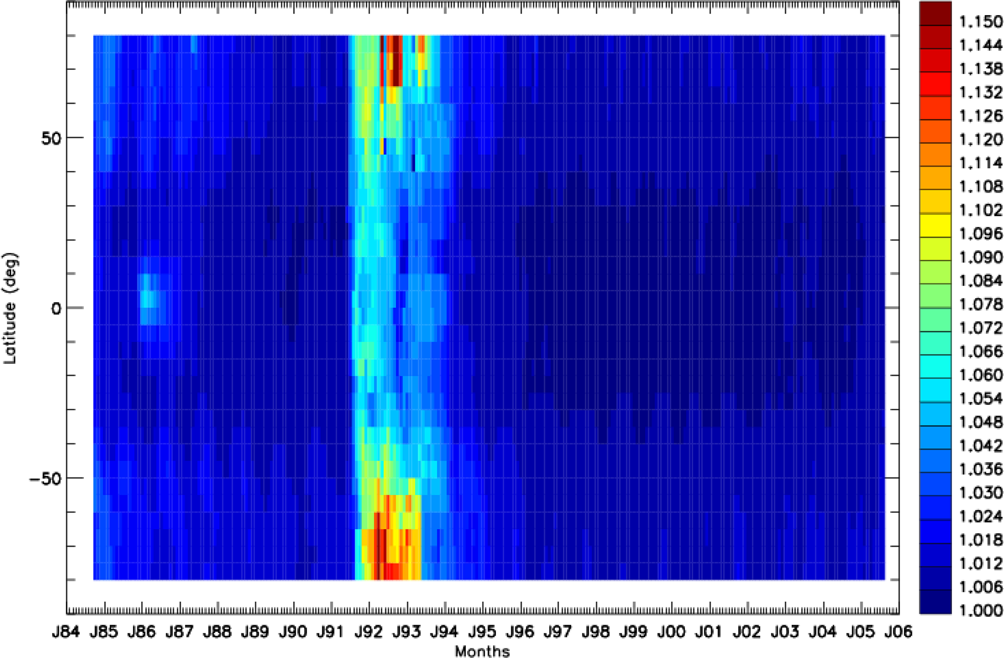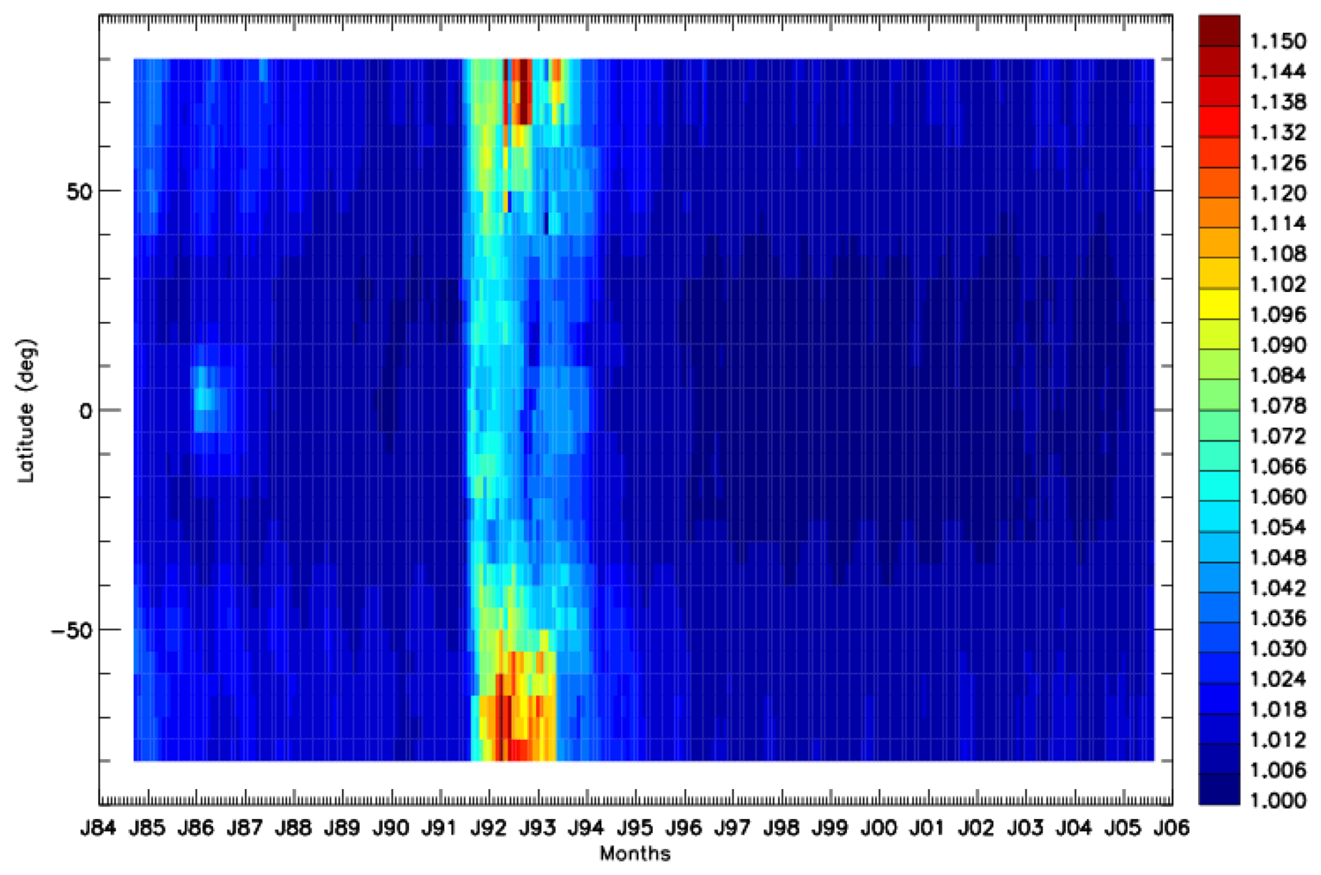 Figure 1Time latitude distribution of the ratio of two-way transmittances between October 1984 and August 2005 from the SAOD at 1064 and 532 nm derived from GloSSAC database.