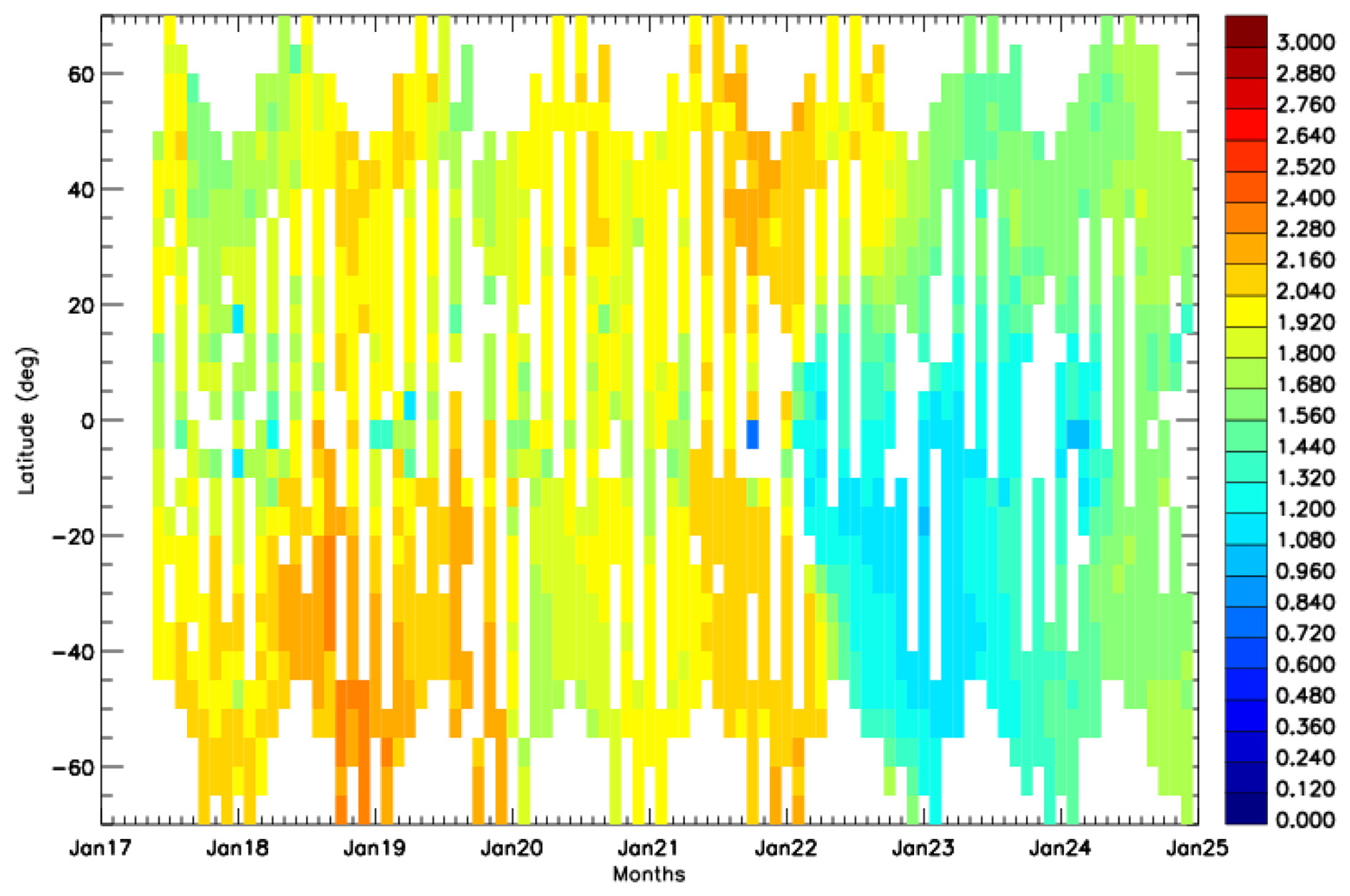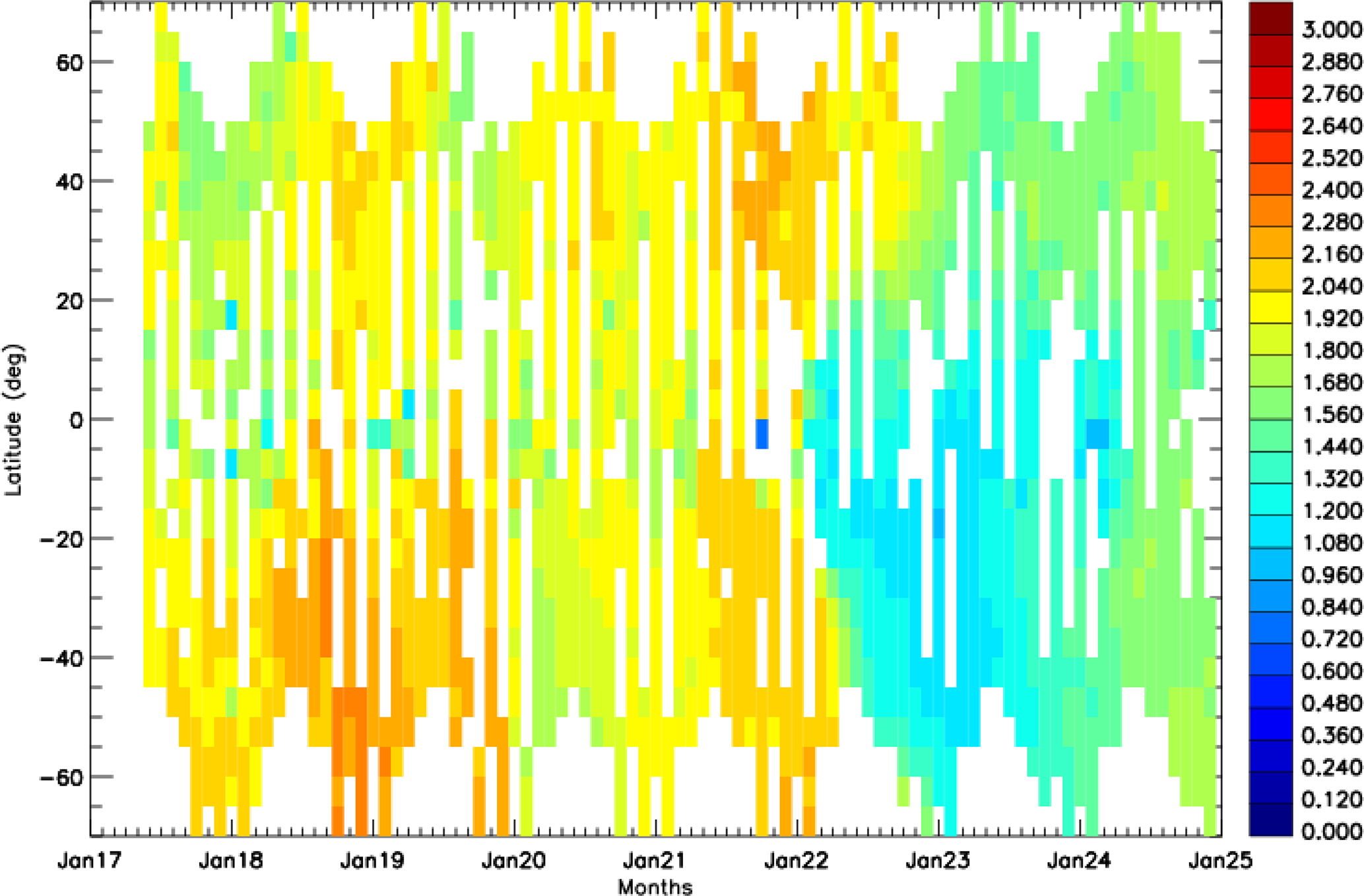Figure 2Zonally averaged time latitude distribution (gridded in 5° latitudes) of the Ångström exponents using 521 and 1020 nm aerosol optical depths between June 2017 and December 2024.