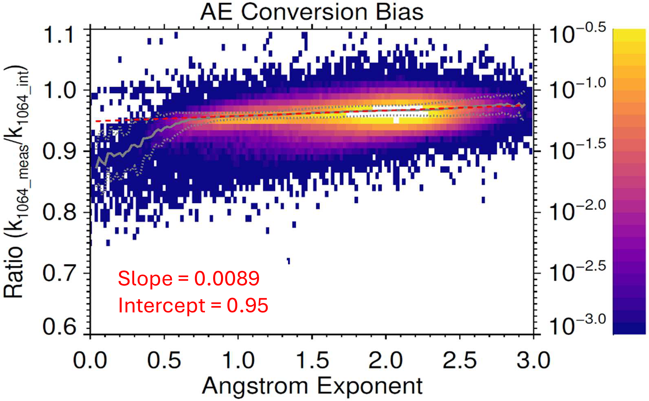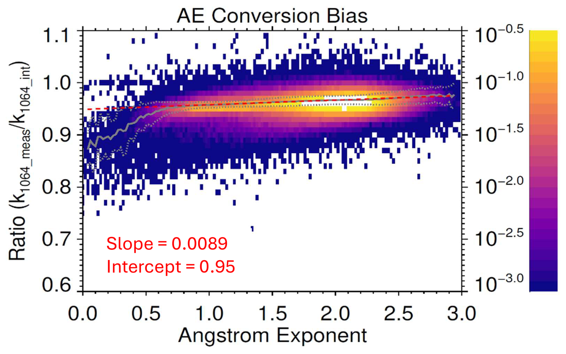 Figure 32-D histogram depicting the bias between the (extrapolated) extinction measurements (k1064_meas) and those obtained by using the 521/1020 Ångström exponents at 1064 nm (k1064_int). This is analogous to Fig. 4 in Damadeo et al. (2024). The vertical scale on the right axis shows the fraction of all occultation events from SAGE III/ISS between June 2017 and December 2024. The solid gray line is the running median and the dashed gray lines show the median absolute deviations from the median. The dashed red line shows the straight line fit to the data.