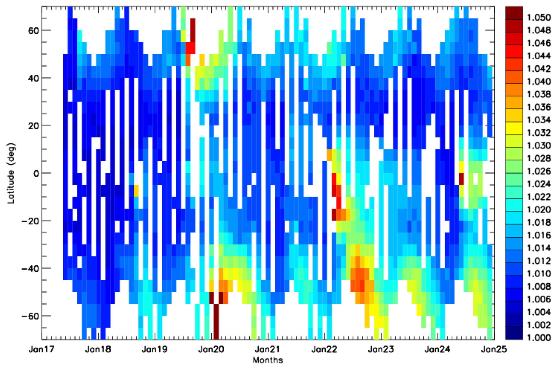 Figure 4Time latitude distribution of the ratio of two-way transmittances between June 2017 and December 2024 from the SAOD at 1064 and 532 nm derived using the SAGE III Ångström exponents.