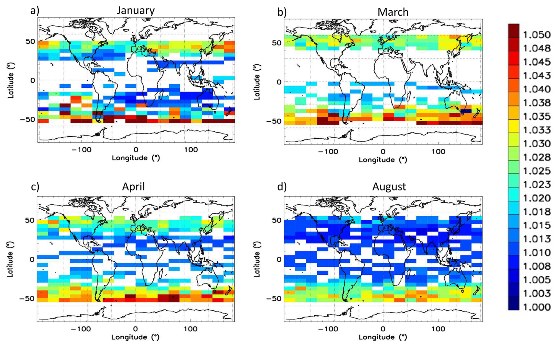 Figure 6Ratio of two-way transmittances at 1064 and 532 nm (gridded at 5°×20° in latitude and longitude) for January, March, April and August 2020 using SAGE III/ISS measurements.