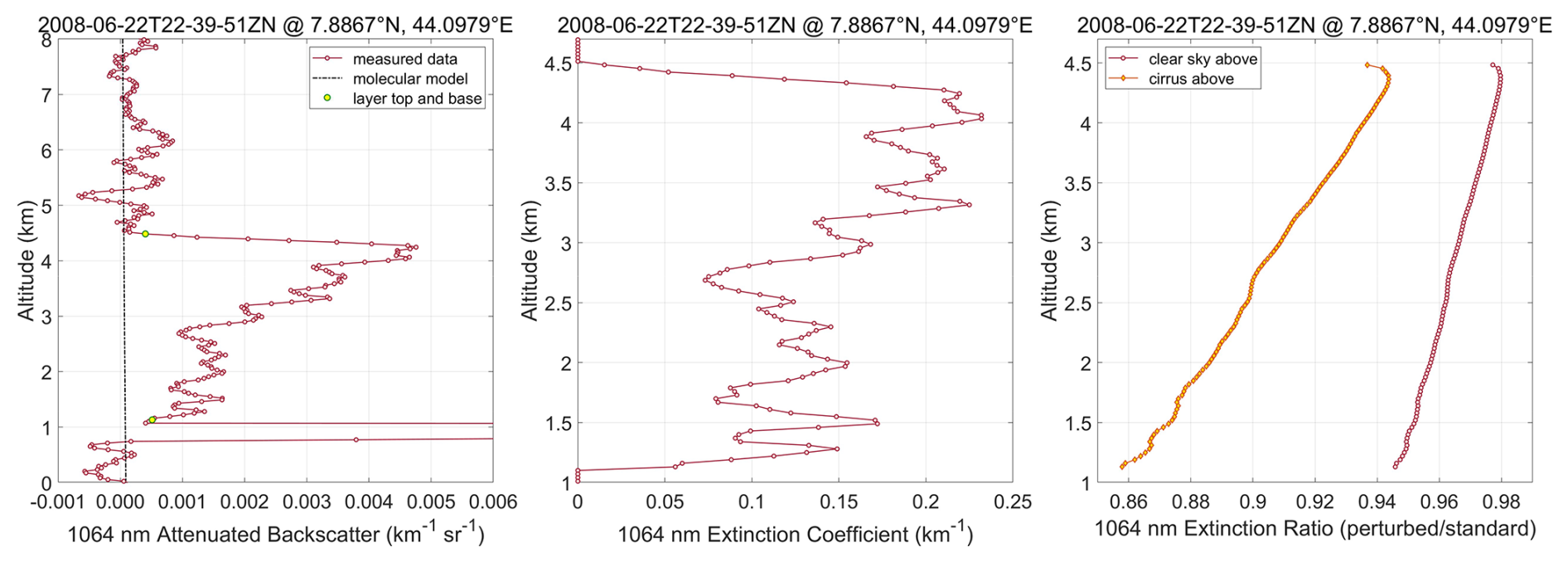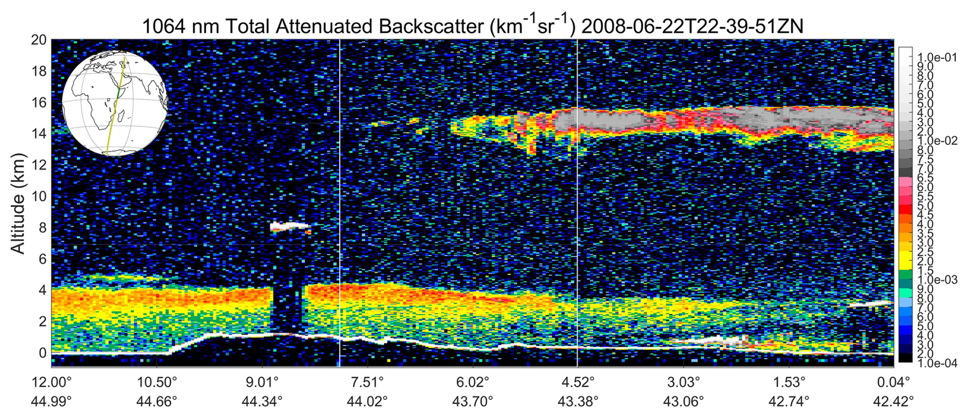 As shown in Fig. 7, for this demonstration we have chosen a nighttime orbit on 22 June 2008 that measures a multi-layer scene of cirrus clouds and dust over the Horn of Africa. Our focus is on the profiles identified by the two white vertical lines. The line at 4.515° N and 43.3742° E highlights a transparent cirrus layer (optical depth = 0.728) with its top at 15.666 km and its base at 12.432 km. This cirrus is lofted above a dust layer extending from layer top at 3.675 km down to the Earth's surface at 0.472 km. The line at 7.8867° N and 44.0979° E identifies a dust layer (optical depth = 0.485) in otherwise clear skies with its top altitude at 4.486 km and its base at the Earth's surface (1.131 km).