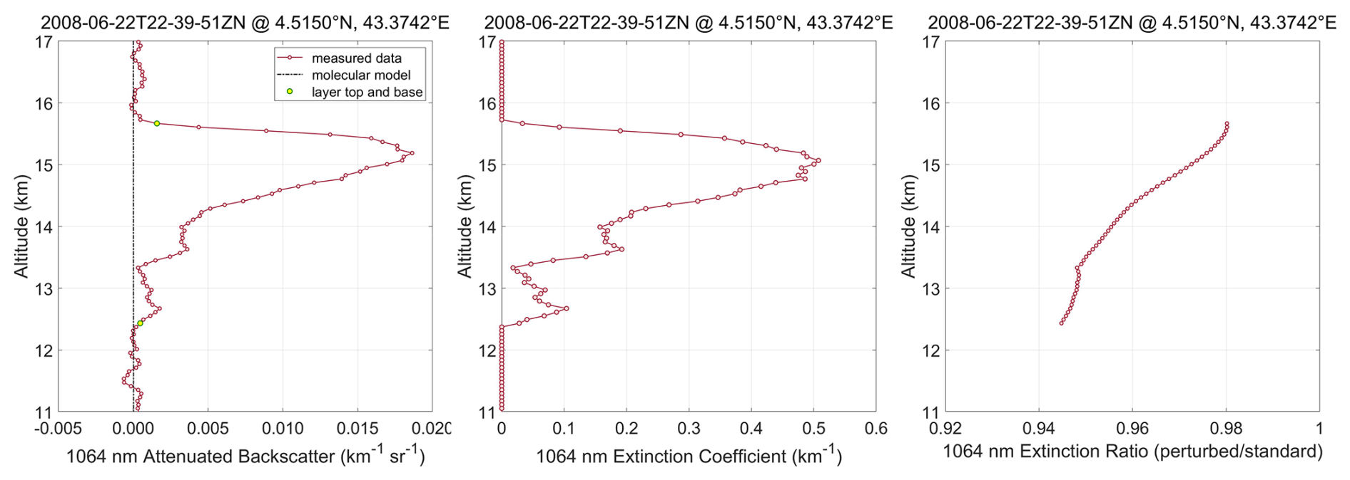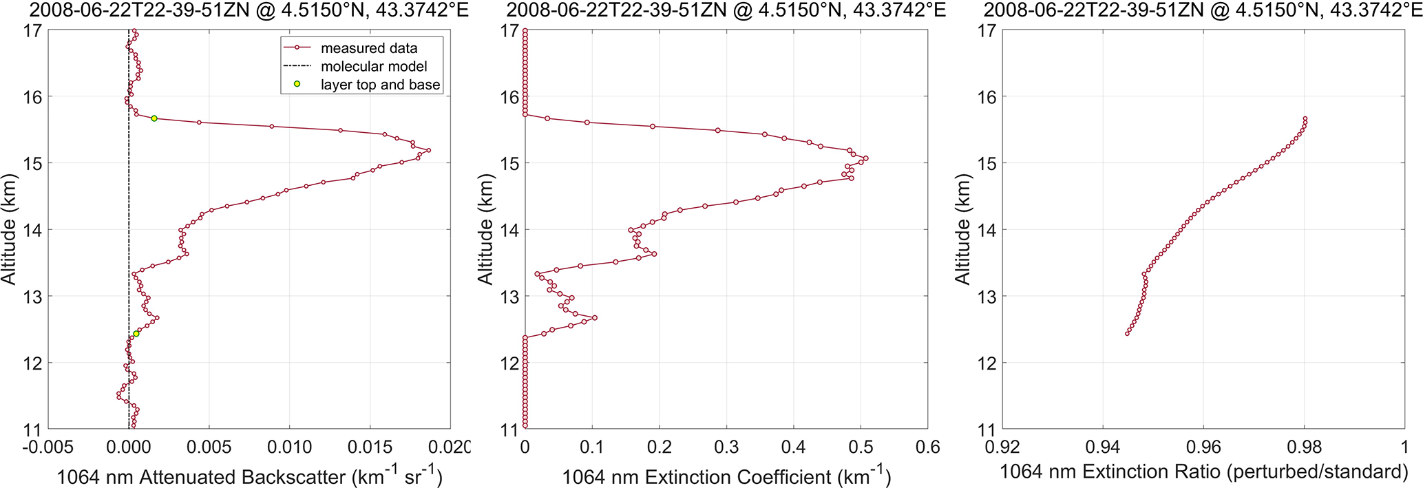Figure 8The left panel shows the profile of the CALIOP level 1b standard 1064 nm attenuated backscatter coefficients measured in the cirrus layer located at 4.5150° N and 43.3742° E in Fig. 7. The center panel shows the particulate extinction retrieved from the attenuated backscatter data using a lidar ratio of 20.987 sr and a multiple scattering factor of 0.723. The right-hand panel shows the quotient of the extinction coefficients retrieved from a perturbed attenuated backscatter profile having a 2 % high calibration bias relative to the measured data divided by the extinction coefficients retrieved from the standard L1b data shown in the center panel.