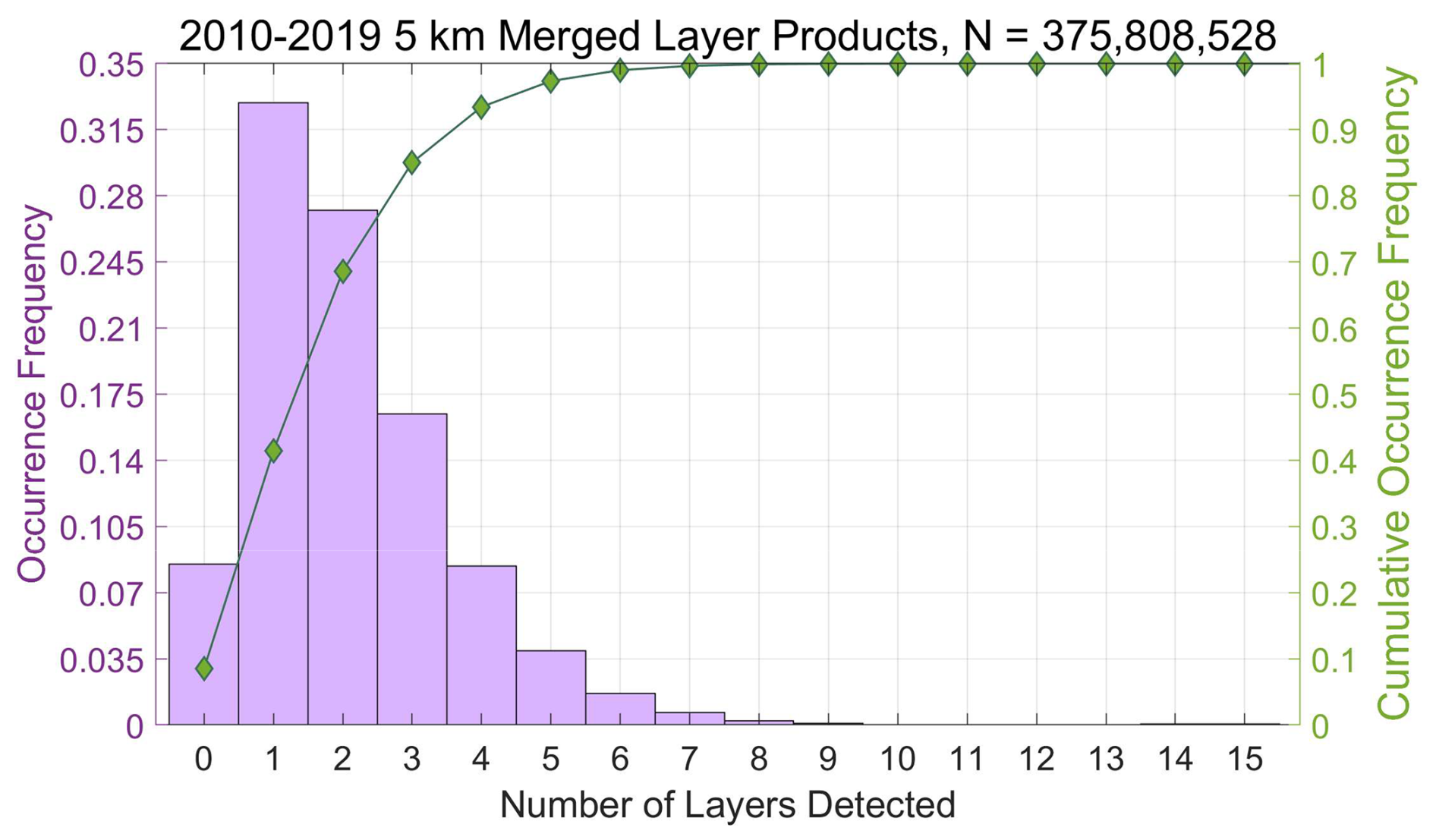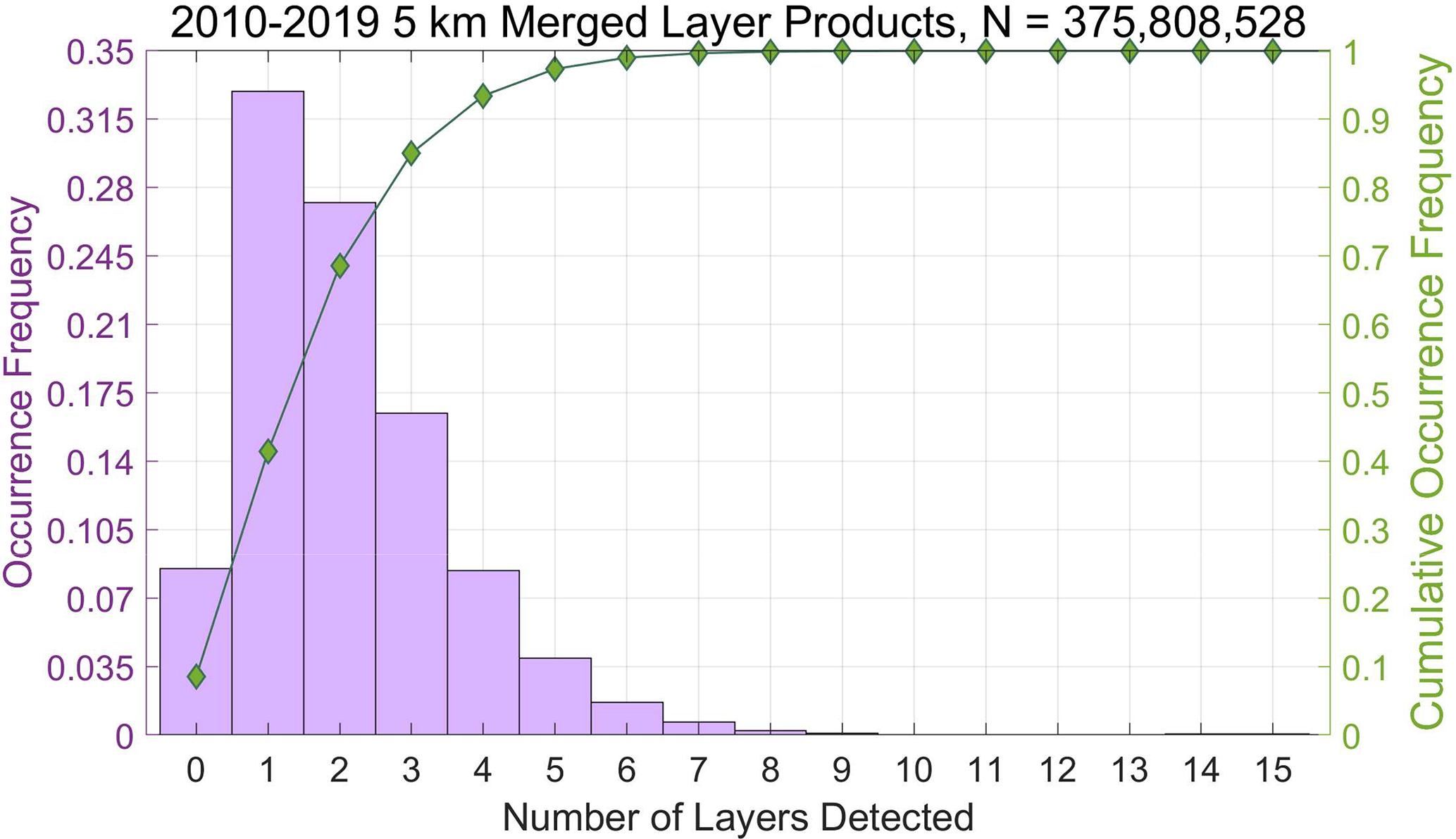 Figure 10Distribution of the number of layers detected in 5 km averaged columns for all measurements acquired from 2010 through 2019 inclusive. Total number of layers = 375 808 528.