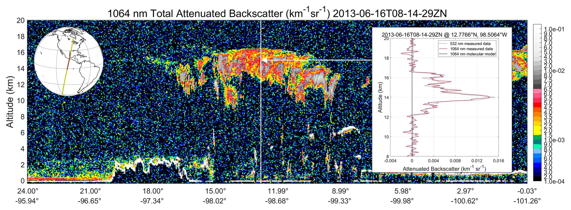 Figure 11Cirrus cloud measured on 16 June 2013 over the eastern equatorial Pacific Ocean off the coast of southern Mexico. The righthand inset shows a single 5 km averaged profile from near the horizontal center of the cirrus in a region where the cloud is transparent and the ocean surface is clearly detected.
