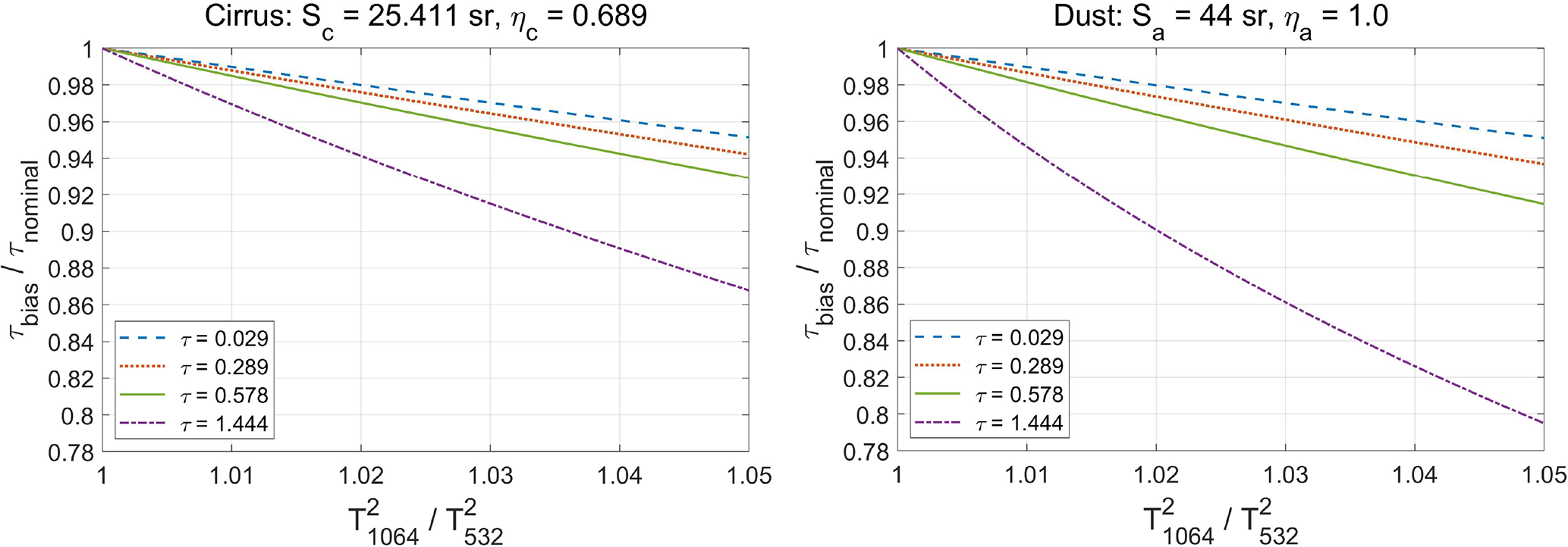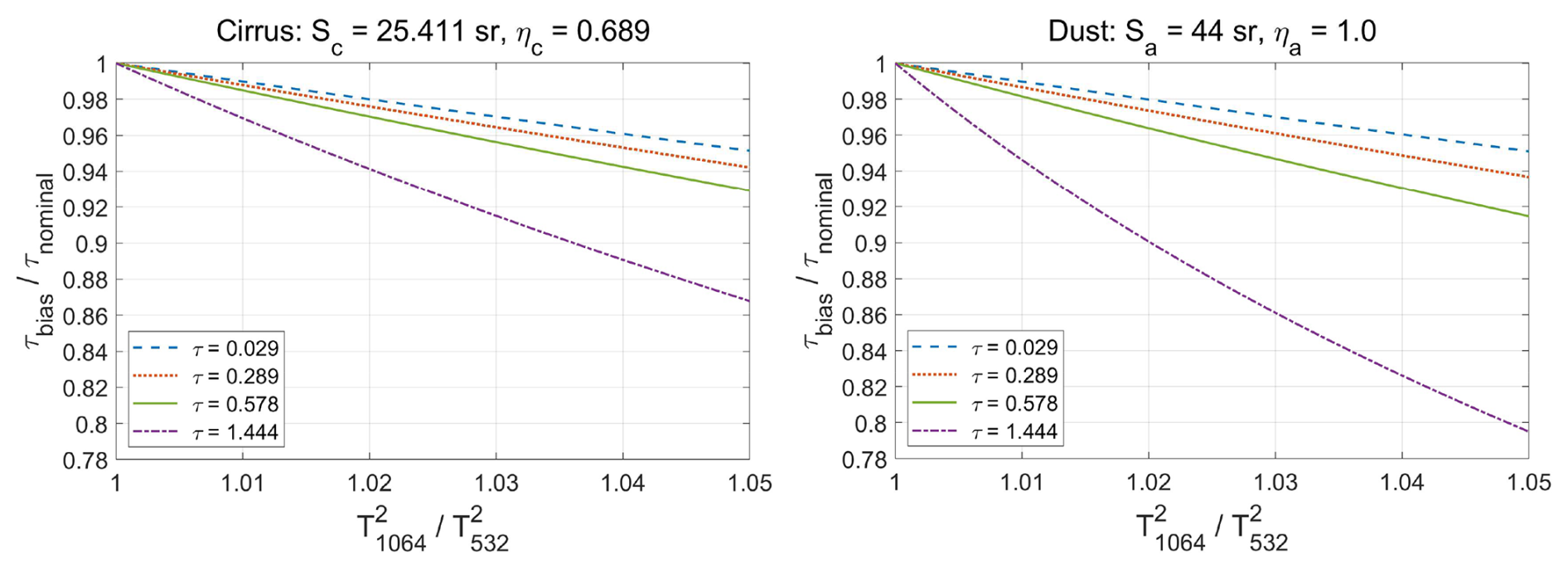 Figure 11 shows a nighttime orbit segment measured on 16 June 2013 beginning in the Gulf of Mexico, passing over southern Mexico, and ending in the eastern equatorial Pacific Ocean. In the righthand inset in this figure we highlight a cirrus cloud detected at 5 km horizontal averaging resolution at 08:26:18.8 UTC. Cloud top and base altitudes, as detected by the CALIOP level 2 processing using the 532 nm scattering ratios, are at respectively, 16.564 and 11.953 km. In Fig. 12 we demonstrate the application of Eq. (6) using a lidar ratio of 25.411 sr, a multiple scattering factor of 0.689, and the 1064 nm optical depth of 1.444 retrieved by CALIOP level 2 analyses. The measured is 0.247 sr−1, compared to 0.246 sr−1 obtained from Platt's equation. To examine a representative range of transparent cloud optical depths, the measured optical depth was scaled by factors of 0.02, 0.2, 0.5, and 1.0 to obtain target optical depths of 0.029 (subvisible cirrus according to Sassen and Cho, 1992), 0.289 (thin cirrus according to Sassen and Cho, 1992), 0.577, and 1.444. The appropriate values of for each target optical depth were computed using Platt's equation. For each optical depth, Eq. (6) was used to calculate the change in optical depth relative to the target as a function of calibration biases (i.e., stratospheric ) that varied between 1.00 and 1.05. Identical values of η1064 and S1064 were used in all calculations. The left panel of Fig. 12 shows the results. All target optical depths show the expected near-linear decrease as a function of increasing calibration bias. Not surprisingly, the relative magnitude of the optical depth decrease grows larger as the target optical depth increases.