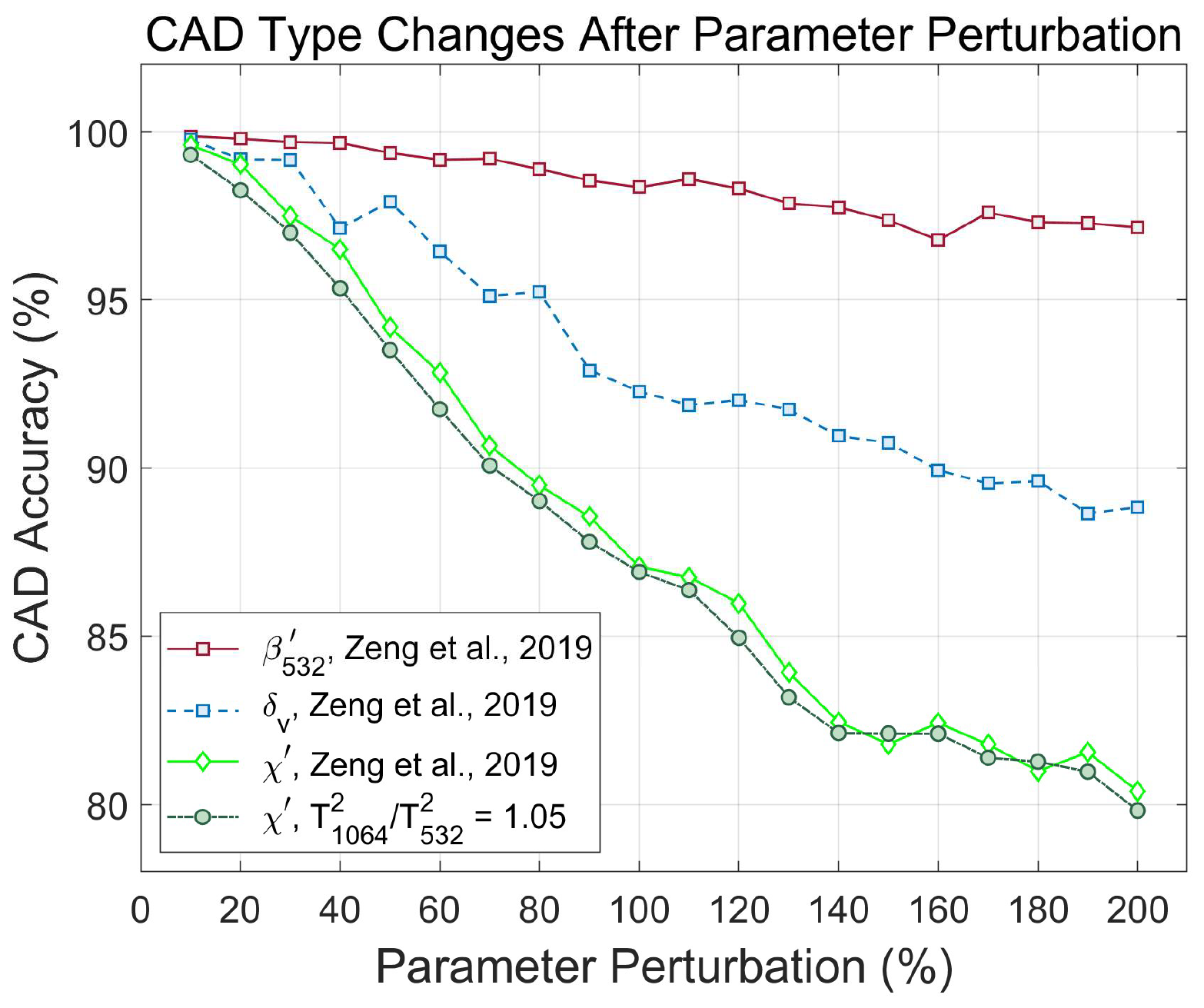 CALIOP's cloud-aerosol discrimination (CAD) algorithm calculates layer CAD scores ranging between −100 and +100 using 5-dimensional probability density functions (PDFs; Liu et al., 2009, 2019). The five PDF dimensions are (1) laser footprint latitude; (2) mid-layer altitude; (3) layer mean attenuated backscatter at 532 nm; (4) layer mean total attenuated backscatter color ratio, χ′, defined as , where the angle brackets indicate mean values computed over the vertical extent of a layer, and (3) layer mean volume depolarization ratio at 532 nm, defined as , where the ∥ and ⊥ symbols represent, respectively, measurements made in the parallel and perpendicular channels. A negative CAD score identified a layer as an aerosol while clouds were identified by positive scores. The latitude and, to a lesser extent, altitude parameters are essentially noise free. This is not true, however, for the three remaining measured parameters, which are all affected to various degrees by random noise and/or calibration biases. Of CALIOP's three direct, onboard measurements, the 1064 nm channel has the lowest in-layer SNR and the largest calibration biases, suggesting that χ′ is the most uncertain parameter in the PDF feature vector. Furthermore, when Zeng et al. (2019) used Monte Carlo studies to characterize the sensitivity of a fuzzy k-means version of the CAD algorithm, they found that CAD accuracy was degraded significantly more by biases in χ′ than by commensurate errors in either of the other two measured parameters. In Fig. 13 we reproduce the findings shown in Fig. 13b in Zeng et al. (2019), which quantifies changes in CAD evaluation (i.e., cloud vs. aerosol) as a result of individual input parameter errors ranging from 10 % to 200 %. The red, blue, and bright green lines show exactly the same data as Zeng's Fig. 13b. The dark green line shows the degradation in CAD accuracy that would occur for an additional 5 % bias in the 1064 nm calibration coefficient; i.e., for stratospheric , representing the upper end of the calculated values seen in Figs. 5 and 6. The maximum absolute difference between the light green and dark green data points is less than 1.2 %, implying that biases in stratospheric of 1.05 or less would yield near-negligible change in the CALIOP CAD assessments.