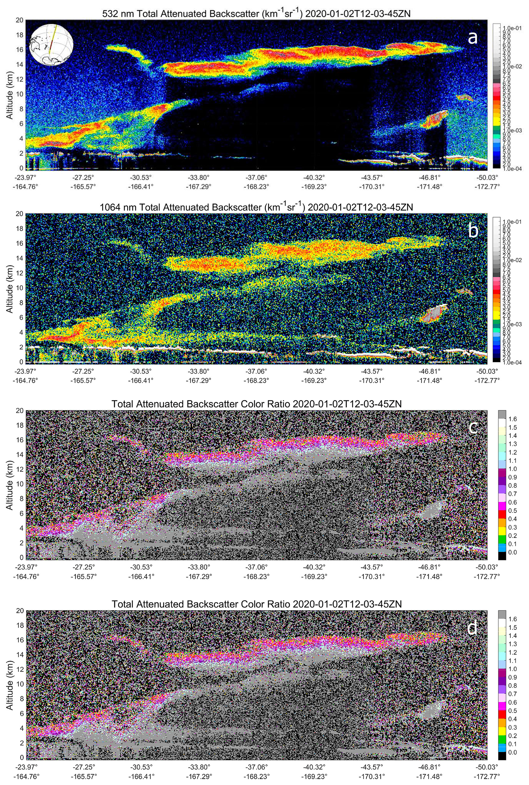 Figure 14Pyro-Cb smoke from Australian bush fires measured on 2 January 2020; panel (a) shows 532 nm attenuated backscatter coefficients; panel (b) shows 1064 nm attenuated backscatter coefficients; panel (c) shows total attenuated backscatter color ratios (1064 nm 532 nm) computed using the data in panels (a) and (b); panel (d) shows total attenuated backscatter color ratios computed with a 5 % high bias in the 1064 nm calibration coefficients.