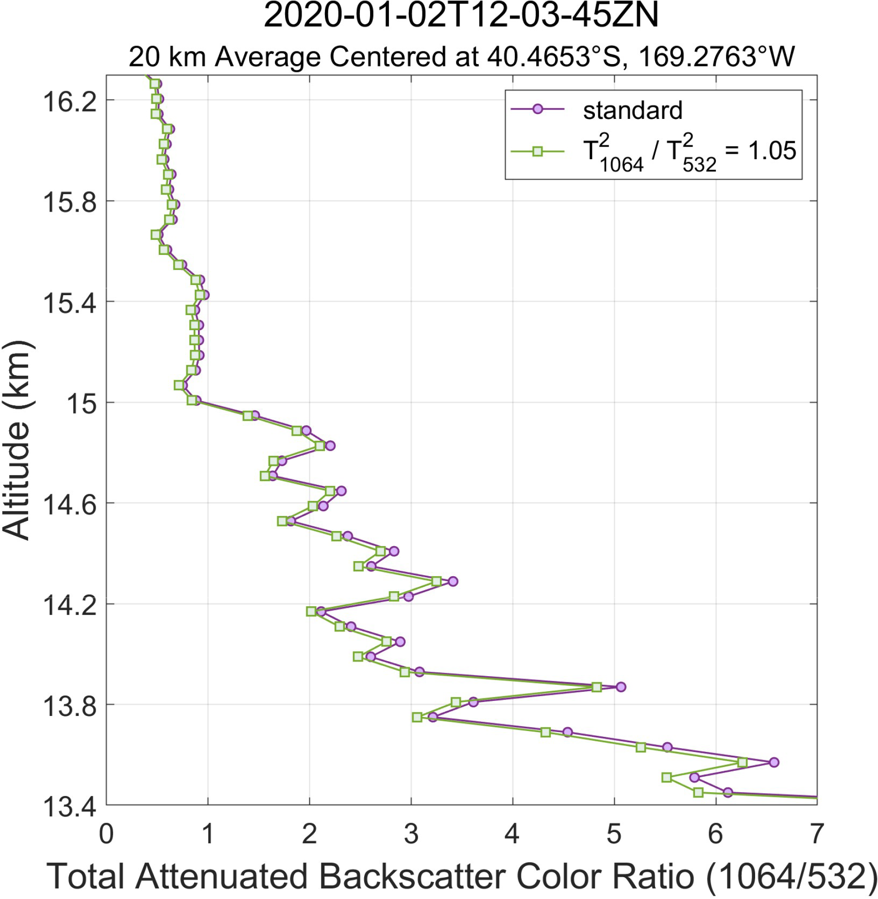 Figure 15Comparison of standard and perturbed profiles of total attenuated backscatter color ratios extracted from the smoke layer shown in Fig. 14 and averaged over 20 km along-track (60 laser pulses). The purple line shows the χ′ profile from CALIOP's standard processing while the green line shows perturbed color ratios for which the 1064 nm calibration coefficient was increased by a factor of 1.05.