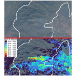 As a first qualitative exercise, a single scene on the Myanmar/Thailand border with visible smoke plumes is selected for closer examination, see Figs. 8 and 9. The scene contains Thailand's Doi Pha Hom Pok national park, a more forested upland region running north to south through the center of the scene, and also extending to the north east. The west (Myanmar) and south east (Thailand) of the scene is lower land with higher levels of human activity and these are the regions of the scene for which AOD has been retrieved.