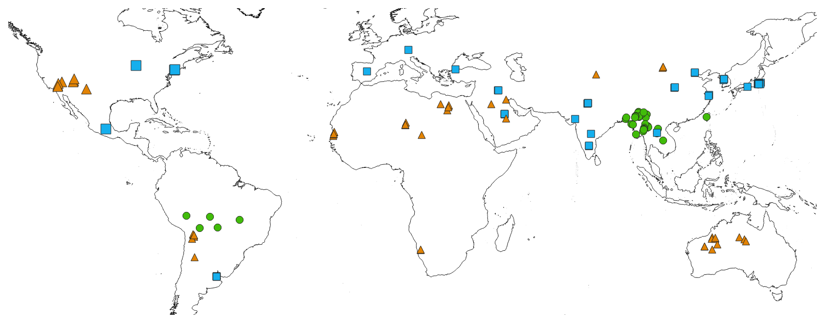 Figure 1Scene locations. Locations of scenes chosen for RTOA comparison. Green circles are vegetation, orange triangles are desert, blue squares are urban.