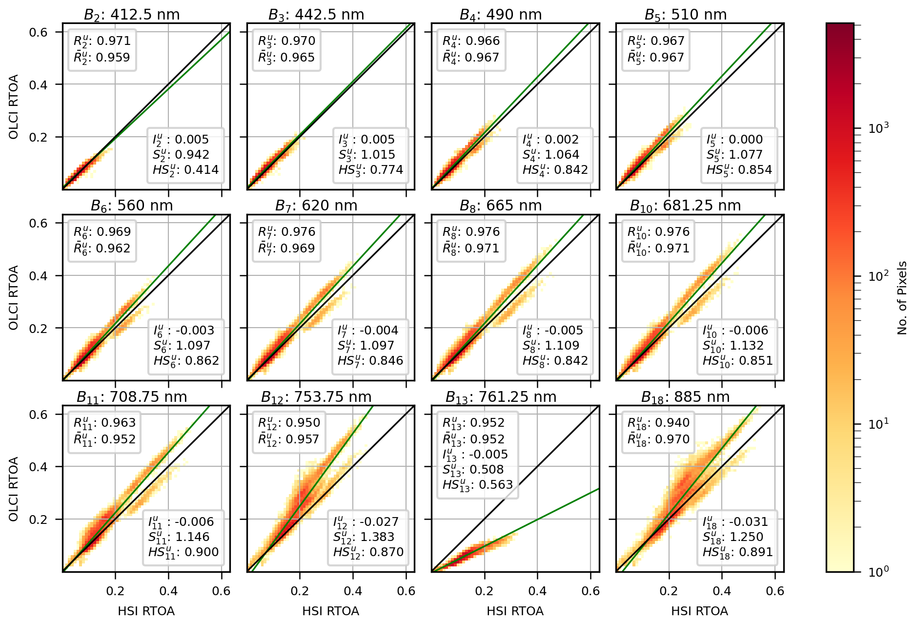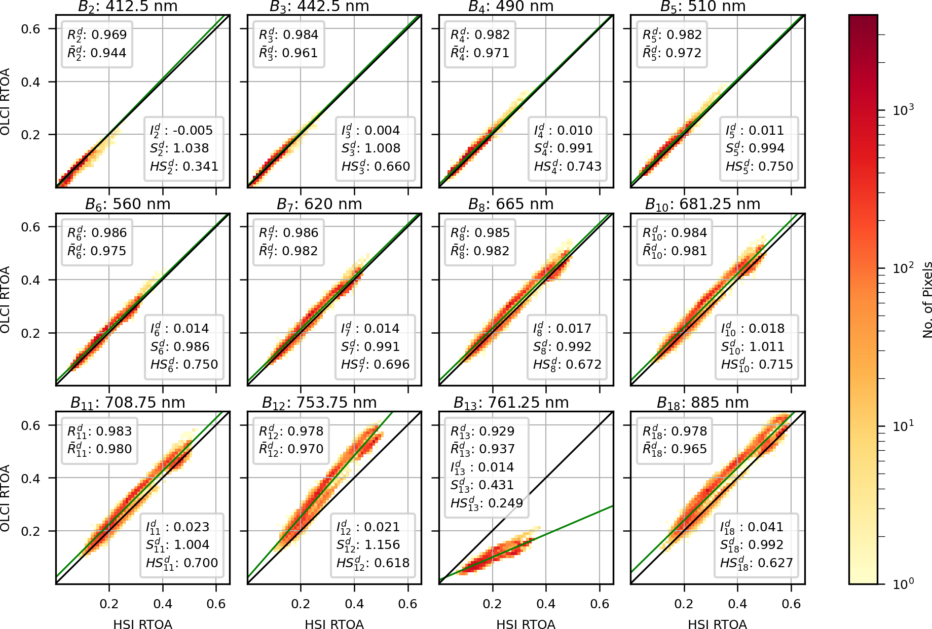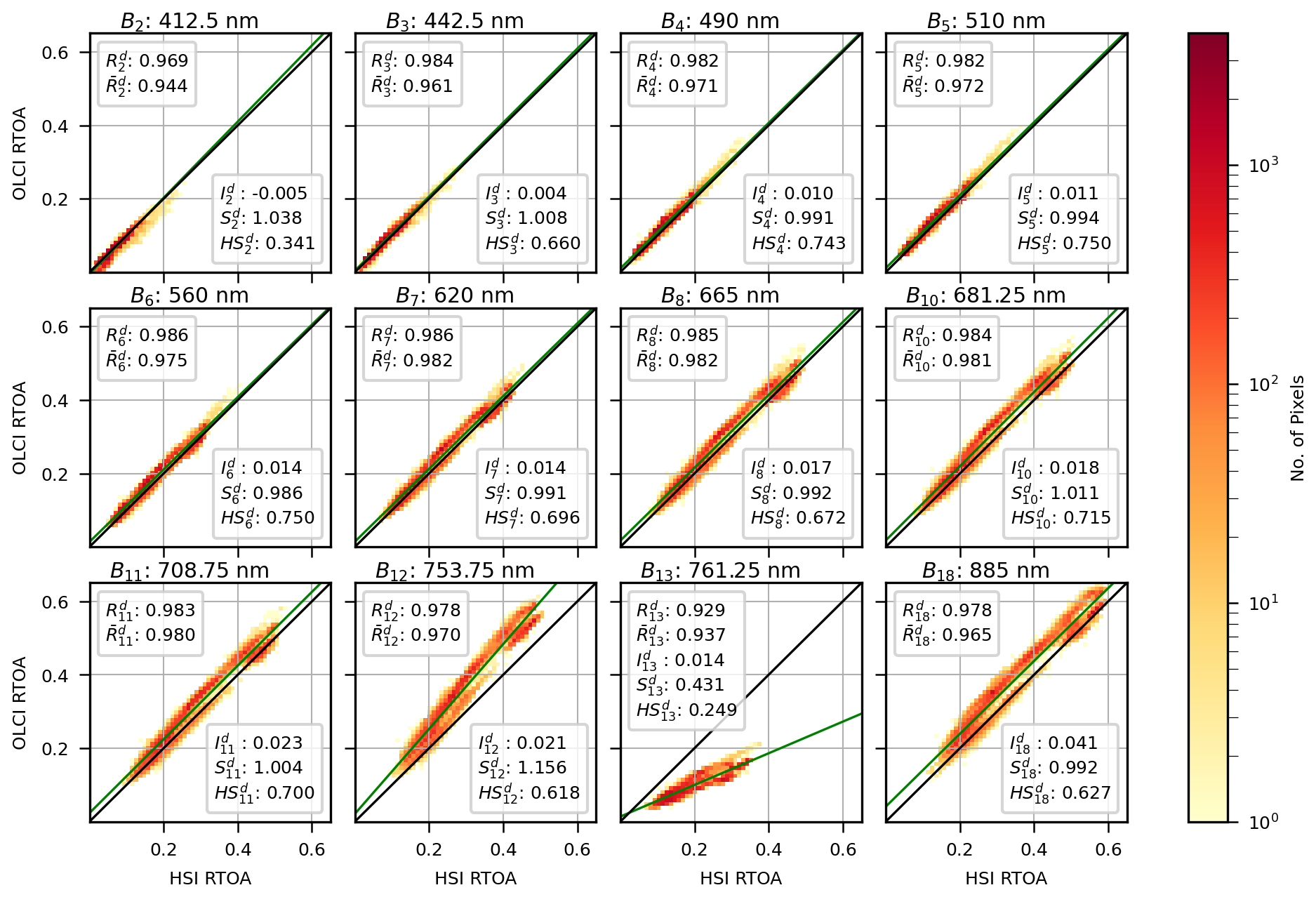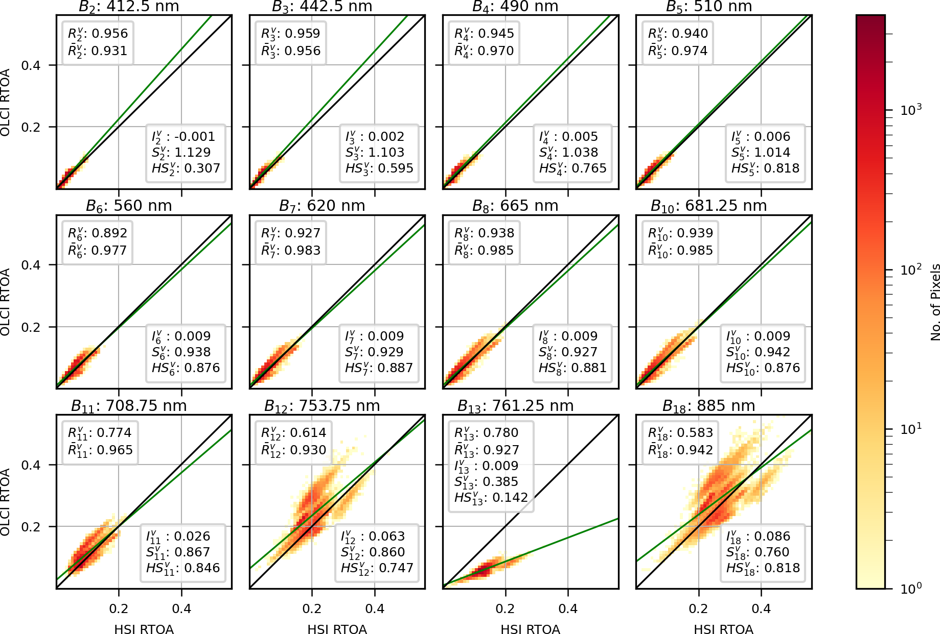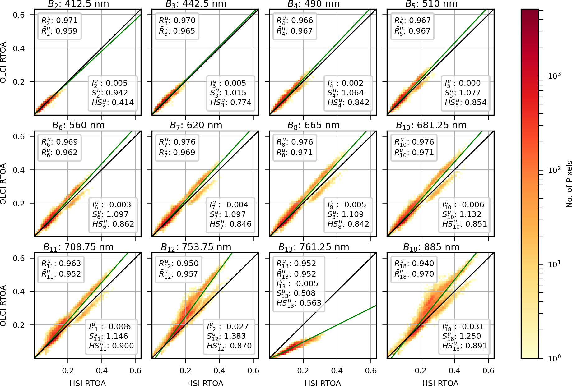 Presented in Fig. 2 is the OLCI vs. HSI RTOA comparison for all 12 bands in Table 1 and all 50 desert scenes. Note that the contribution to the RTOA from Rayleigh scattering (which overwhelmingly affects the lower wavelength bands) has been subtracted from the RTOAs (Fröhlich and Shaw, 1980). Going forward, when referring to the RTOA comparison for band i (Bi), this means the comparison of RTOA for OLCI band i (Oi) with the RTOA for the nearest HSI band. is the Pearson correlation coefficient of RTOA for all pixels in all desert scenes for Bi. If represents the RTOA correlation for Bi and desert scene j, then the mean of for all j is represented by . For each Bi, the best fit for all pixels in all scenes is depicted as a green line, and the intercept and slope of this line are denoted by and .