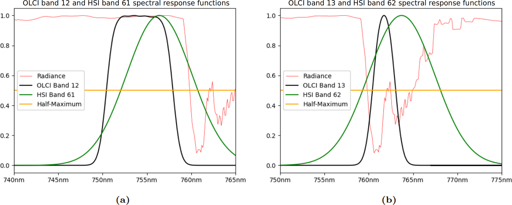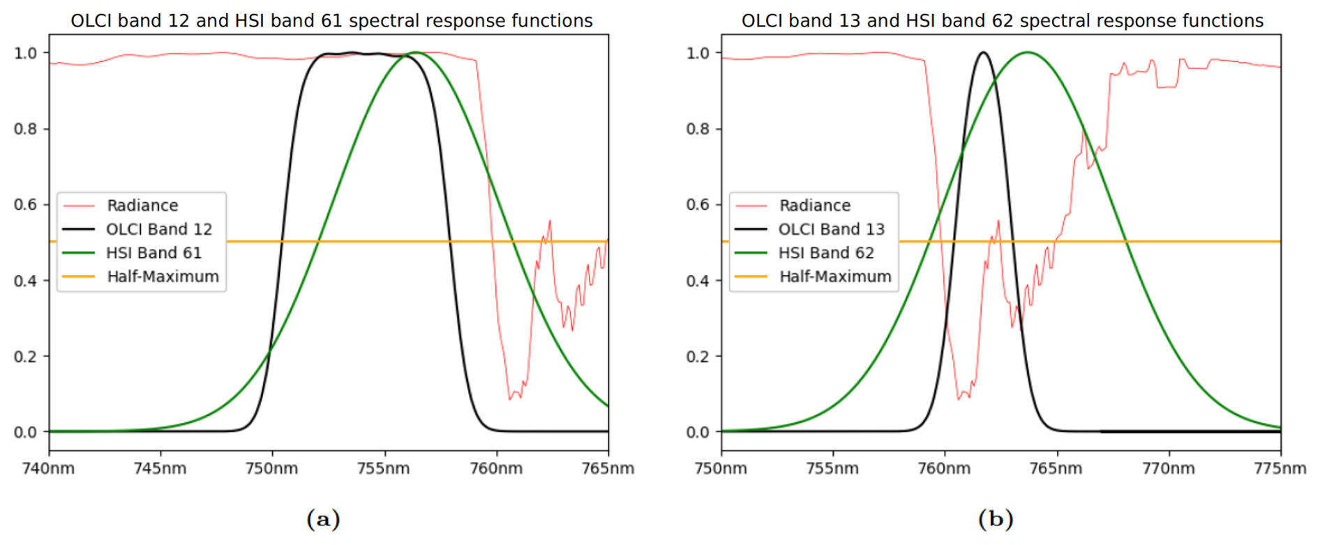 Figure 3O2 A-Band. The spectral response functions of (a) O12 and H61 and (b) O13 and H62, overlain on a 1 nm rolling-average of radiances simulated using SCIATRAN (Mei et al., 2023) at 0.1 nm spectral resolution (red line). All curves are plotted relative to their maximum within the range. The orange line is intended as a visual aid to help identify the FWHM of the two spectral response functions.