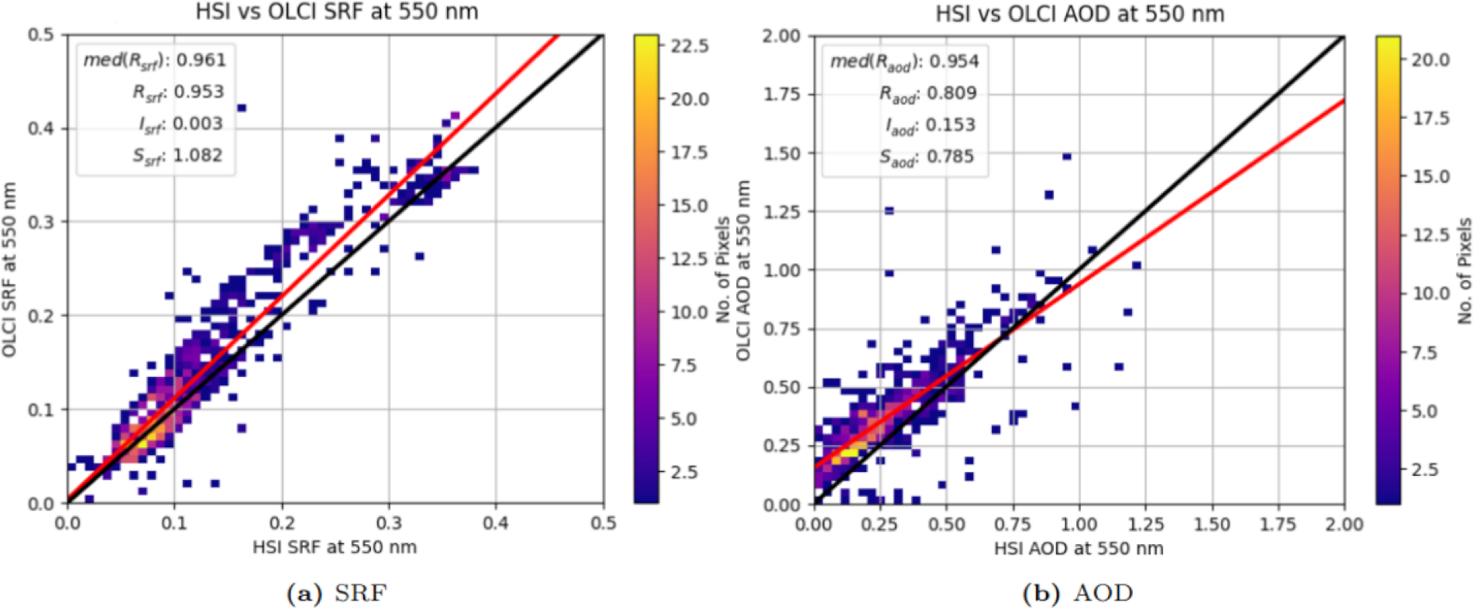 The SRF comparison is very good, with Rsrf=0.953, Isrf=0.003, and only the slope deviating slightly from what would be ideal; Ssrf=1.082. For higher surface reflectances (predominantly desert scenes, but some urban scenes too) HSI underestimates OLCI and this is generating the slope. The AOD comparison has Raod=0.809, Iaod=0.153, and Saod=0.785. Most AOD values are low, in the region of the graph before the red best fit line intersects the black 1:1 line, thus HSI underestimates OLCI for AOD too.