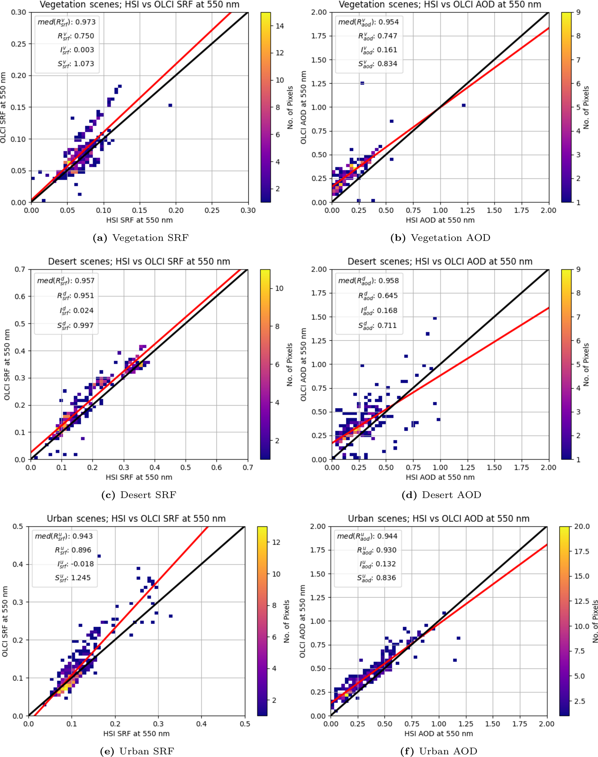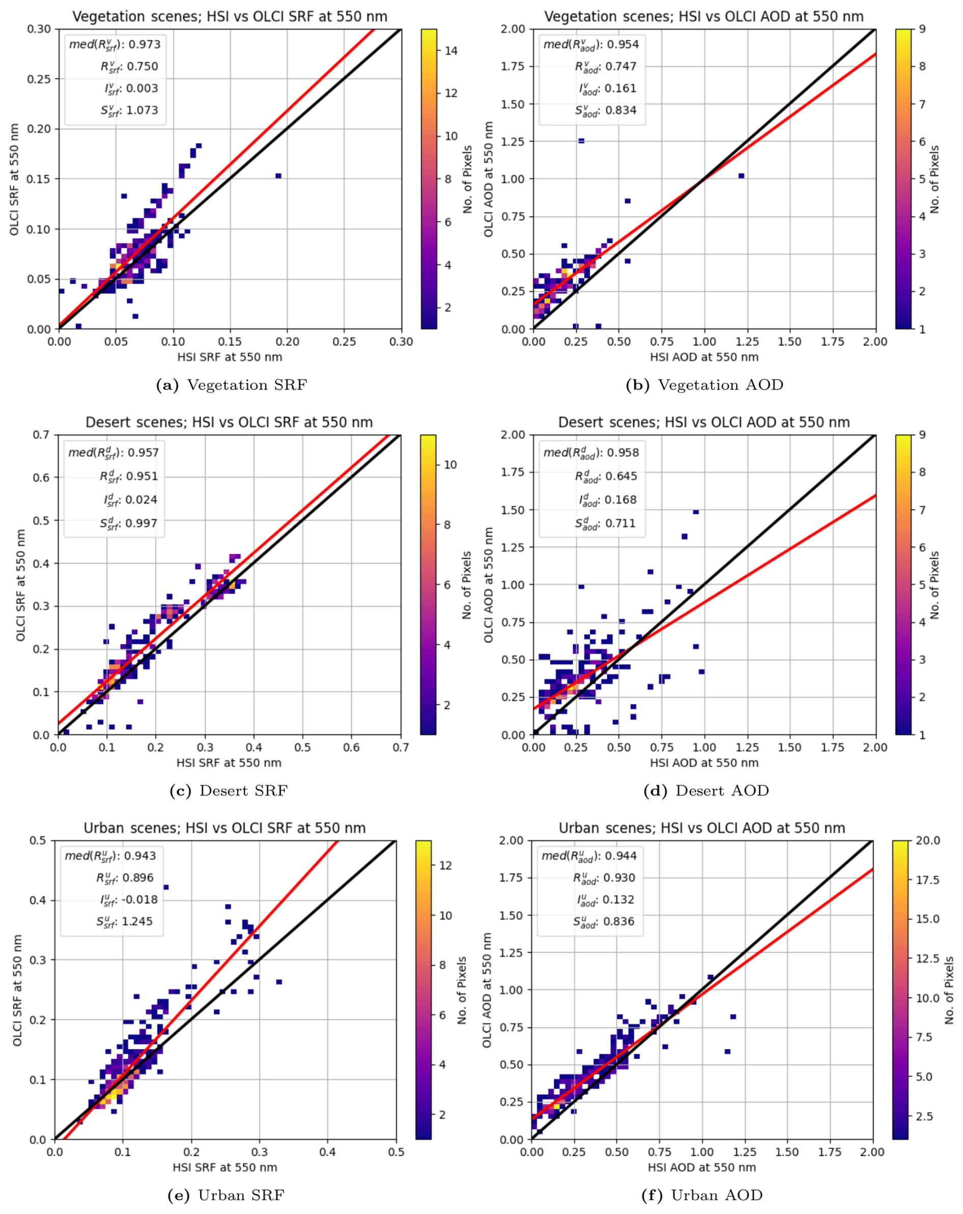 Figure 7OLCI vs. HSI SRF and AOD by scene type. Comparison of XBAER-derived SRF and AOD at 550 nm using colocated, cloud-free HSI and OLCI vegetation, desert and urban scenes. Retrieved SRF and AOD are at 10 km resolution.