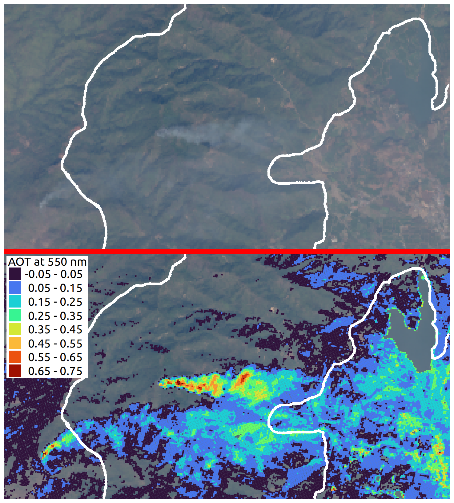 Figure 9Biomass burning plumes. Two biomass burning events are visible in the RGB image (top, EnMAP data, © DLR 2023. All rights reserved); one in the center, one in the south west. The plumes are visible in the AOD retrieval (bottom). The white lines indicate the borders of the Doi Pha Hom Pok national park. The western border is also the Myanmar/Thailand border.
