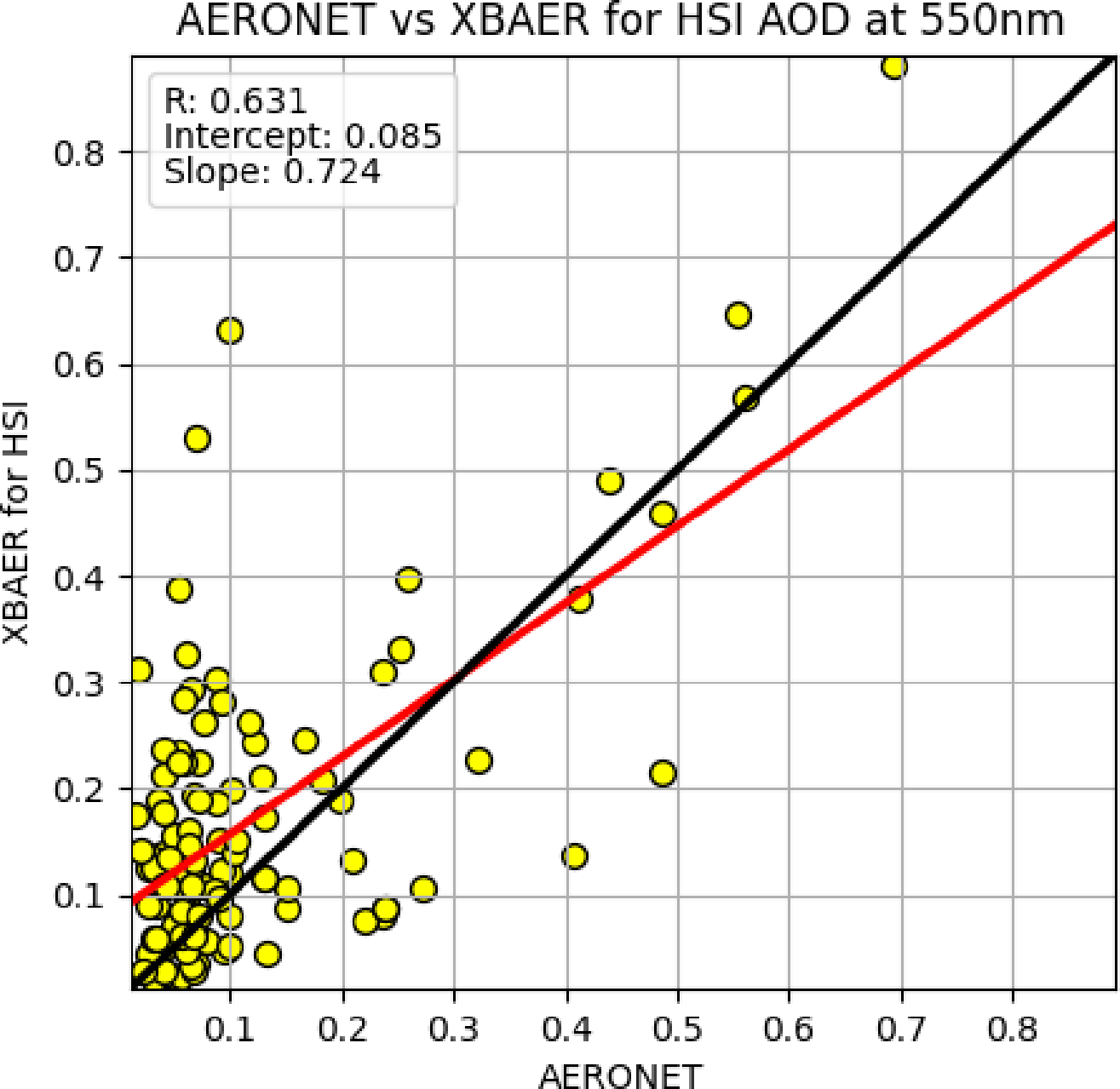 The overall comparison has R=0.631, I=0.085, and S=0.724. 85 % of the colocations have low aerosol loading (AOD<0.3). Presumably high AERONET/low XBAER colocations are due to XBAER not being adapted for high resolution HSI data, and high XBAER/low AERONET AOD are due to cloud contamination. Some cloud contamination is expected as the XBAER cloud mask has had the cloud top height checks deactivated (as discussed in the previous two sections), and other threshold values have not yet been calibrated to HSI radiances.