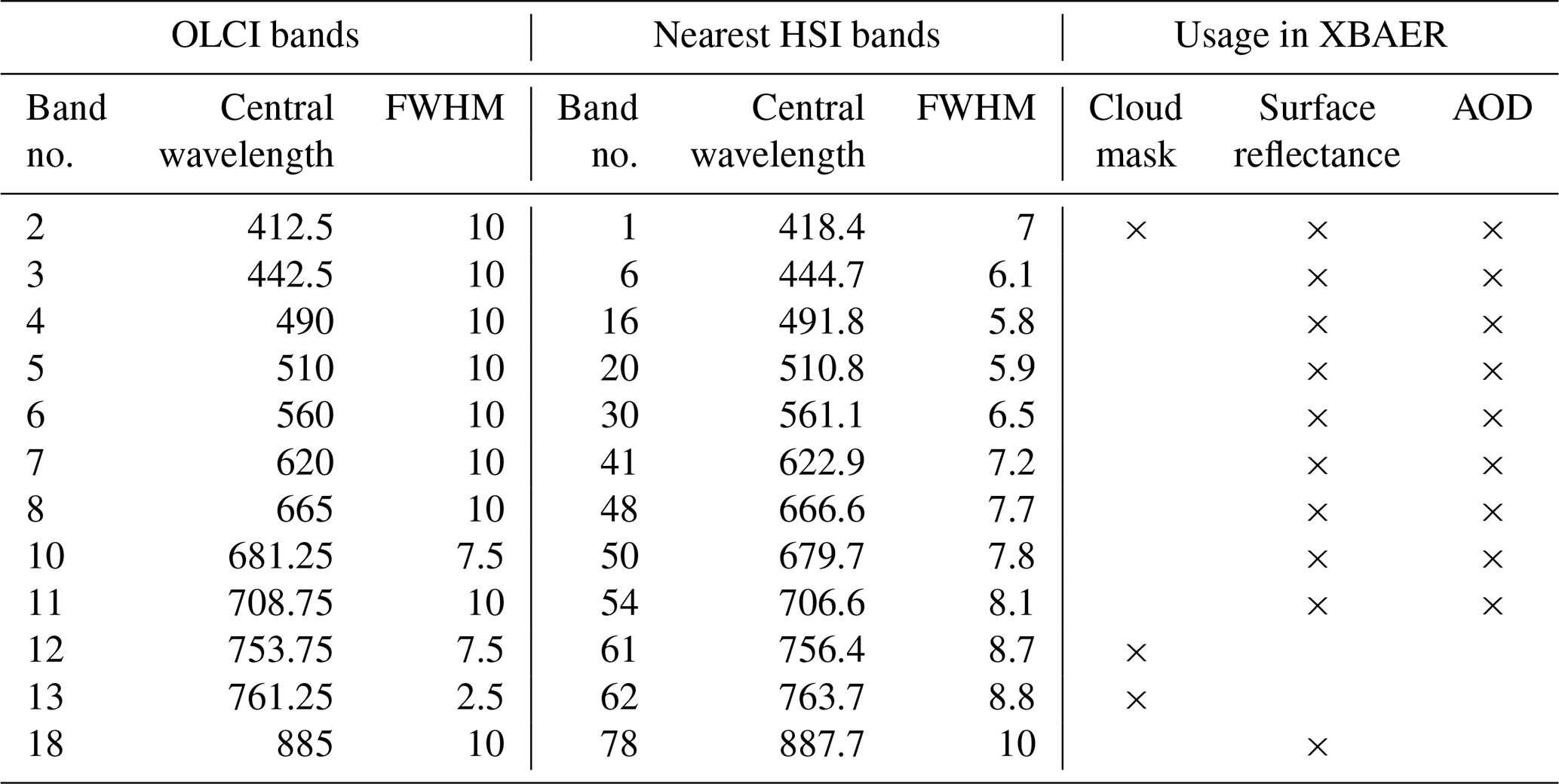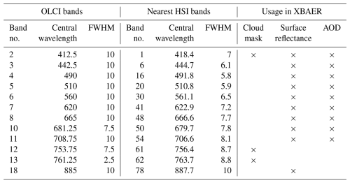 Table 1Band information. OLCI bands used in XBAER, their central wavelength and full width at half maximum (FWHM), equivalent information for the nearest HSI band, and what that band is used for in XBAER.