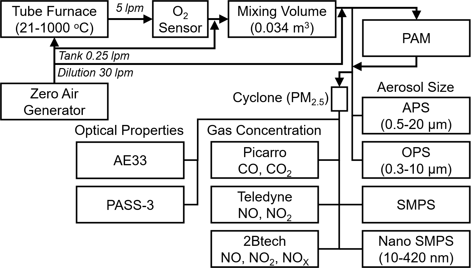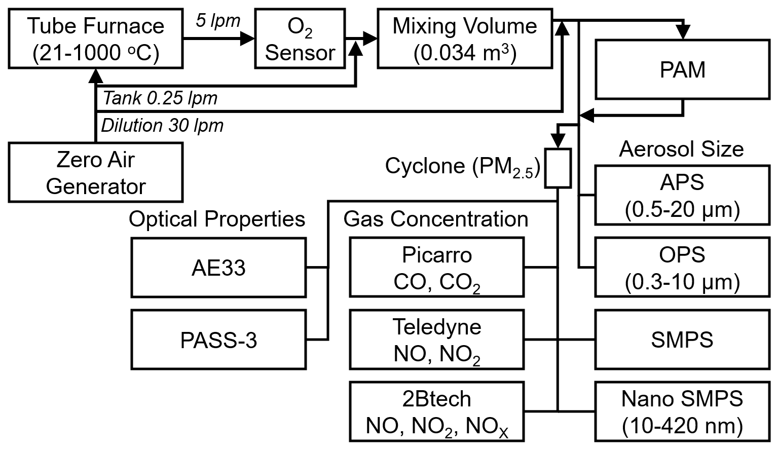 Such aethalometer absorption measurements have been applied to BB aerosols generated in a laboratory environment, which enables the control of fuel type, exposure to volatile organic compounds (VOCs) and oxidants, and combustion state (McRee et al., 2024; Moschos et al., 2024). Previous work in our laboratory has used a tube furnace for generating BB aerosol, which has allowed a high degree of flexibility in accessing different combustion states of a fuel (Pokhrel et al., 2021a). Owing to its flexibility and commercial availability, the use of this combustion setup has been growing (Benedict et al., 2024; Hoffer et al., 2017).