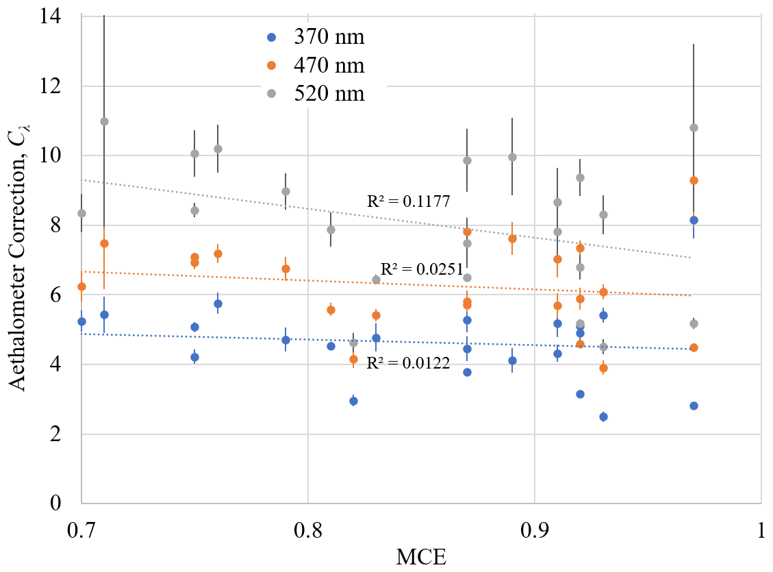 Characterizing the wavelength-dependent properties of PM is important for understanding their role in radiative forcing and subsequent climate effects at the regional and global scale (Bond et al., 2013; Kirchstetter et al., 2004). When using a filter-based instrument, there are three main factors that should be addressed (Bond et al., 1999; Liousse et al., 1993; Petzold et al., 1997): (1) filter fibers increase attenuation by multiple scattering (which increases optical path), (2) aerosols embedded in the filter increase light attenuation because of scattering, and (3) as light absorbing particles collect in the filter, the attenuation gradually increases (reduces optical path for loaded filter). The correction factor Cλ accounts for multiple scattering of light within the filter and the resulting enhancement of the optical path of aerosol particles that load up the filter (Ferrero et al., 2021). Previous studies suggest that a single correction factor at each aethalometer wavelength may not be sufficient, because it has been shown to vary based on type of aethalometer, material of the filter, seasonal or diurnal patterns that are produced by PM compositional changes, and wavelength (Bernardoni et al., 2021; Yus-Díez et al., 2021). To investigate dependencies of the correction factor in this study we analyzed its relationship with burning state and SSA.