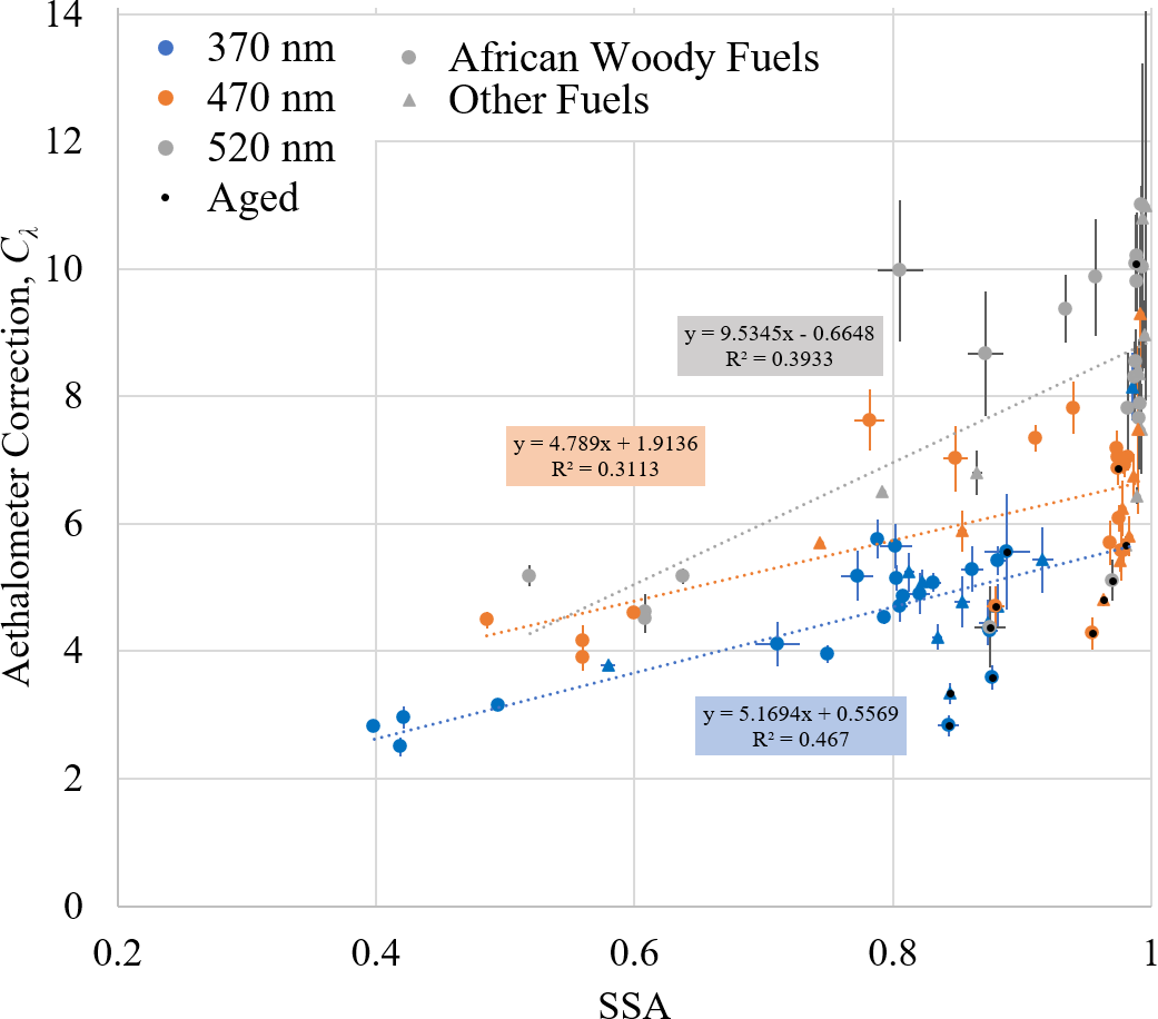 We have measured the wavelength-dependent optical properties of BB aerosol from North American and sub-Saharan African fuels. We used a PASS as a reference instrument to calculate the multiple-scattering correction factor Cλ of AE33 absorption measurements at 370, 470, and 520 nm. We found that there was no real dependence of Cλ on MCE. When Cλ was plotted against SSA, values slowly rose at low SSA values, followed by a sharp rise around an SSA of ∼ 0.9. The trend of our Cλ observations closely follow those of Yus-Díez et al. (2021) for C637. Cλ at other wavelengths were generally higher at all SSA values and did not fit the functional form of particularly well, despite its previous use (Schmid et al., 2006; Yus-Díez et al., 2021). This is likely due to, at least in part, the to the scatter in the data and number of observations. Yus-Díez et al. (2021) had a large number of ambient observations that they binned and averaged as a function of SSA before fitting those averages, whereas we have 31 burns with a total of 282 data points. A number of functions operating on either SSA or Cλ were explored and the best functions of each are found in Table 4, along with the fit parameters at 370, 470, and 520 nm. In terms of R2 and X2, showed the best performance. This will provide an important parametrization of Cλ specifically geared towards BB aerosol from African fuels under different aging states, and is of particular importance for future field work on the continent. Weighted mean values of Cλ in this work were C370=3.69, C470=5.65, and C520=6.39, which was somewhat higher than several mean values proposed in previous works, though the same trend is observed for works where a trend is evident. This indicates that the multiple-scattering correction factor Cλ in aethalometer measurements depends strongly on SSA and wavelength-dependent corrections are essential, particularly for C370 that was different than C470 and C520. Since this dependence varies with aerosol composition, a fixed correction value is inadequate, especially in biomass burning scenarios.