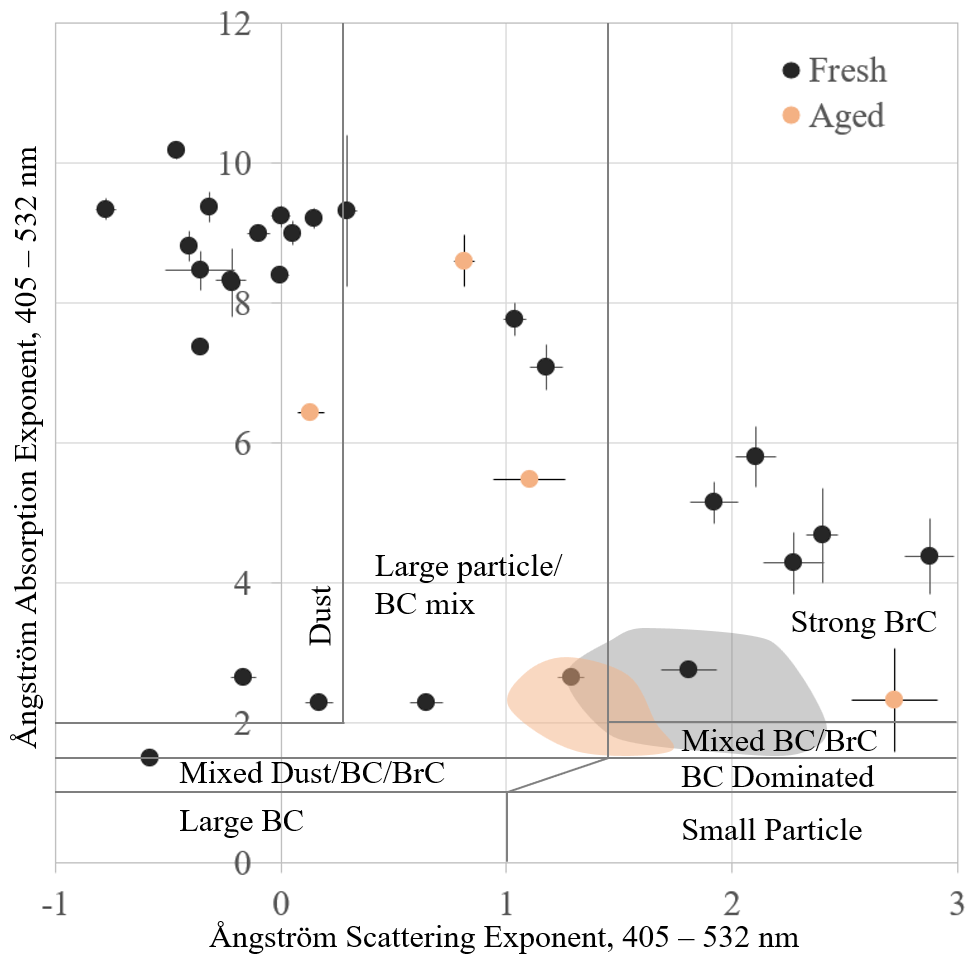 Characterizing the wavelength dependent properties of PM is important for understanding their role in radiative forcing and subsequent climate effects at the regional and global scale (Bond et al., 2013; Kirchstetter et al., 2004). AAE describes the wavelength dependence of aerosol absorption, which assumes a power-law relationship (Moosmüller et al., 2011). Plots of ASE vs AAE have been used to differentiate different particle types and the source of those particles. Measurements in this work are presented on this so-called Ångström matrix plot in Fig. 4 with source labels are derived from Cazorla et al. (2013). Also included are previous observations of African fuels for fresh and photo-aged emissions (McRee et al., 2024).