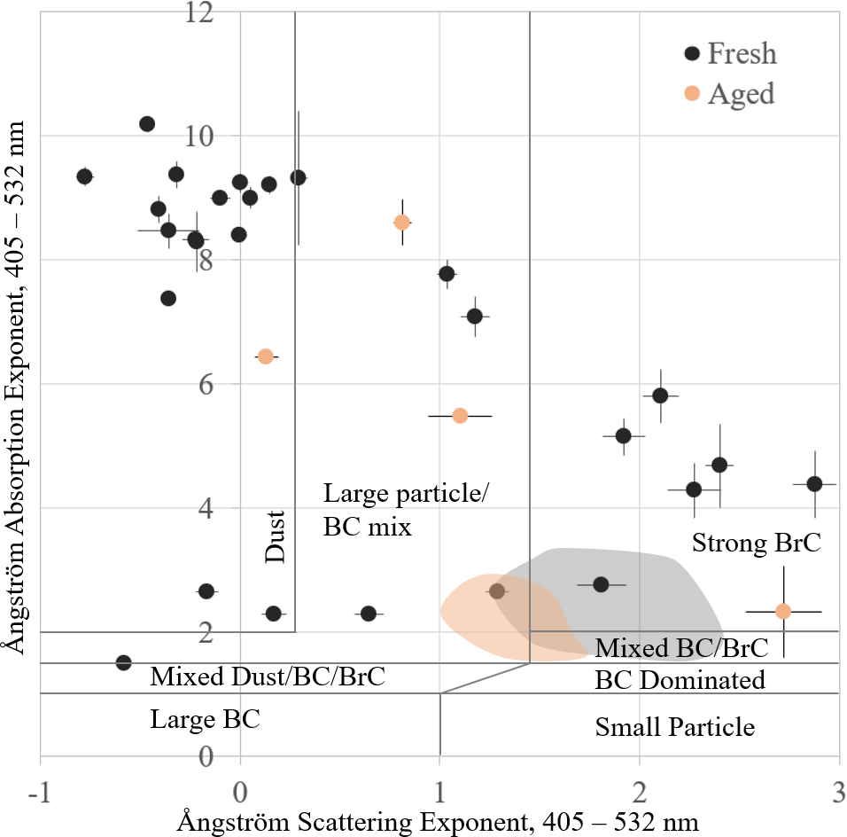 Figure 4The Ångström matrix plot (ASE vs AAE) for fresh (black dot) and PAM-aged (tan dot) observations in this work. Previous measurements on similar fuels are shown in shaded areas for fresh and photo-aged BB aerosol (McRee et al., 2024).
