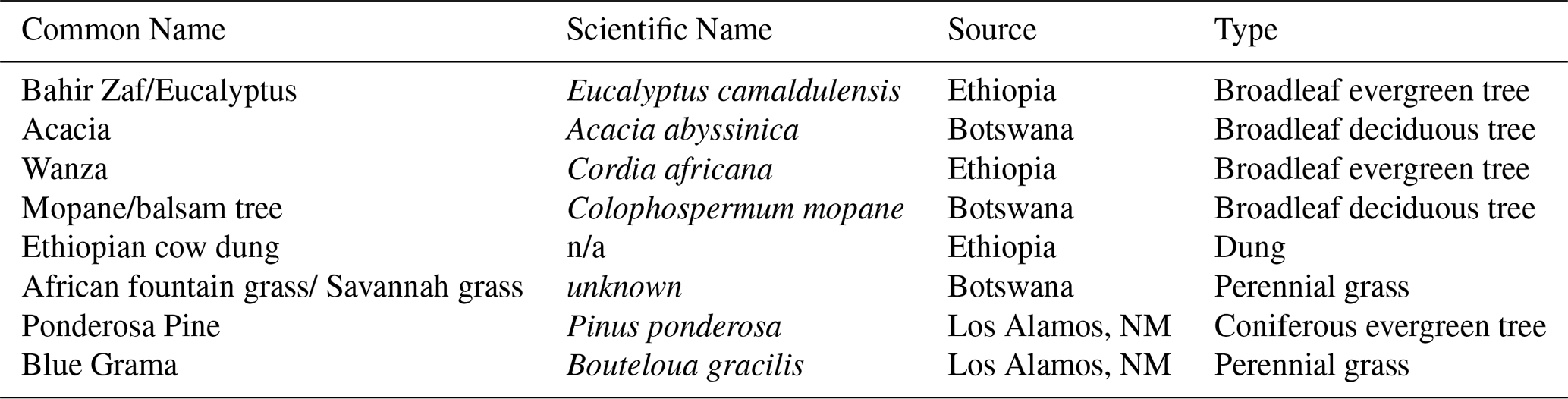 African biomass fuels obtained directly from Ethiopia, Botswana, and a few additional fuels that were collected near LANL. These fuels were selected to be representative of those burned for domestic use in Africa and wildland fires in New Mexico (NM). A thorough description of each fuel is given in Sect. S1 in the Supplement. Fuel samples were stored in a fume hood to dry and their moisture content was measured (PCE-MA 50x, PCE Instruments). All fuels were found to have a moisture content of <10 %, and were considered dry (McRee et al., 2024). The spatial extent and use of each fuel are described in SI and they are listed in Table 1. Botswana samples were collected in Palapye.