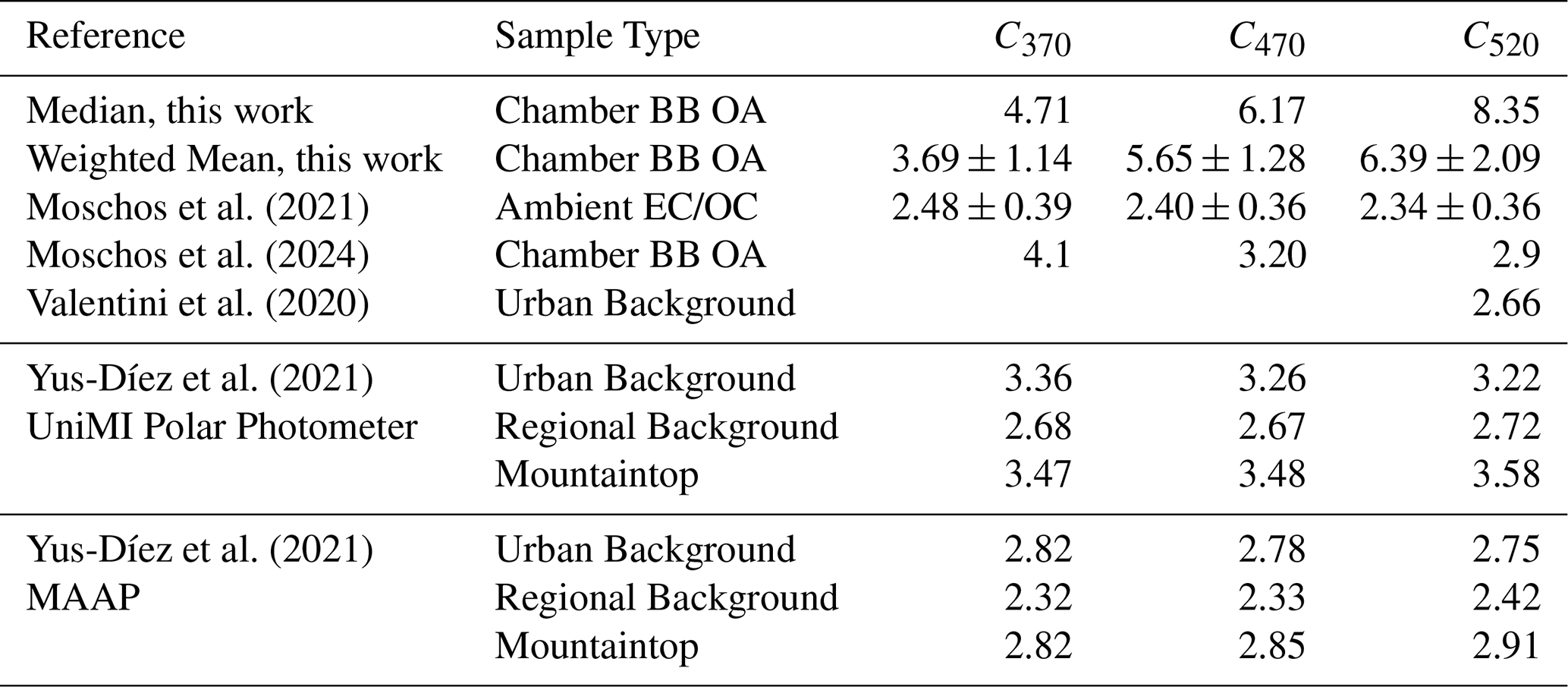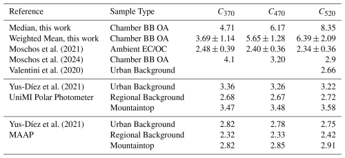 Table 2Mean Cλ for this work and previous works that used an AE33 with model 8060 filter tapes. Errors are 1 standard deviation that represent run-to-run variability, which was greater than the propagated weighted mean standard deviation, or are defined in their respective works. Yus-Díez et al. (2021) report median values.