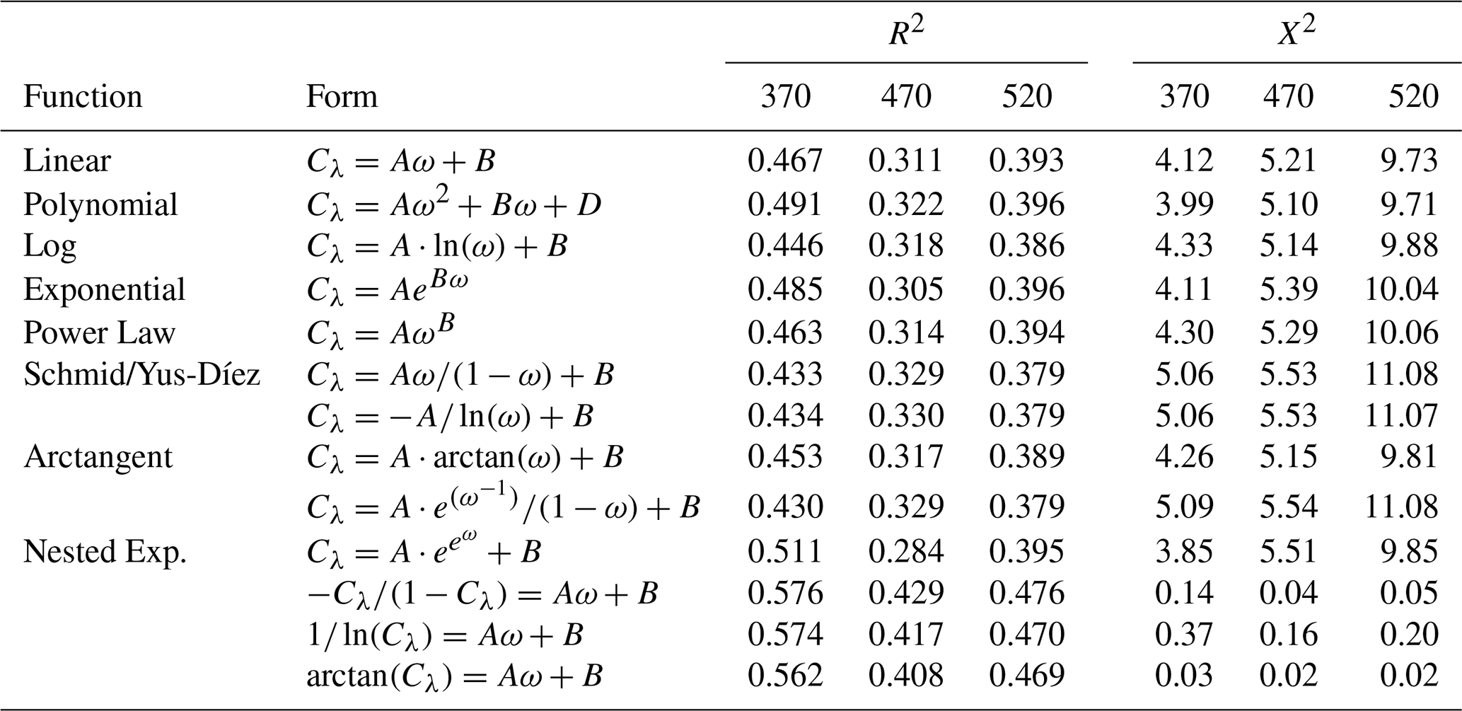 A number of other functions that exhibit sharp rises at higher values were also examined in Table 3. Of those functions examined that fit a function of SSA, the second order polynomial performed the best, though this is to be expected with more fit parameters. The nested exponential function performed had the second highest average R2, though it had the worst R2 for C470 of those tested. This was followed by the exponential function, and then linear and power law fits performing comparably. Other functions, including several sigmoid functions, did not perform as well, on average. A linear fit to several functions that manipulate Cλ were also examined, which performed better than those that only adjust SSA. Along with R2, Table 3 shows how well each function fit the data by calculating the goodness of fit, i.e. Chi squared (X2). Of those, performed the best, where 49 % of the variability of the Y-term is dependent on SSA and this equation had had the second lowest X2. Solving for Cλ, this would have the form , which has a strong potential for future use in SSA-based correction schemes, particularly where filter loading effects are minimized and optical properties dominate the measurement bias. While arctan(Cλ) had slightly lower X2 values, the R2 was also lower, so it exhibited a weaker Cλ dependence. The better X2 for arctan(Cλ) vs. SSA is mainly an artifact of all arctan(Cλ) flattening out.