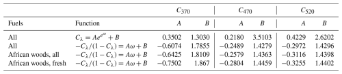 Given the figures of merit for the AE33, mentioned in the introduction, it is likely to see use in long-term monitoring in future field campaigns in Africa. Supporting this, we have examined the above fit functions for woody African fuels (i.e. the first four fuels listed in Table 1), which was a subset of 20–21 data points for each wavelength. The results of this examination are in Table S2, and show general improvement in fit characteristics, with all X2 decreasing and all R2 increasing except the lowest three. The best fit function is still , for the same reasons stated for the full data set. A fit of this function was also done for fresh, woody African fuels. The fit parameters of the best-performing fit equations that manipulate SSA (the nested exponential) and Cλ () are shown in Table 4 and are plotted in Fig. S2 for all fuels, along with fit parameters for African woody fuels.