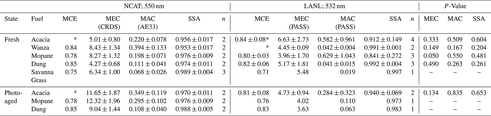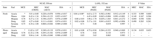 Table 5Comparison of optical properties for fresh and photo-aged emissions from various fuels, carried out at LANL and NCAT (McRee et al., 2024). All cross sections are in m2 g−1. MCEs with a * had one or more values were not recorded because of a lack of CO and CO2 measurements during those experiments, but should be smoldering-dominated, since the furnace temperature was 450 °C at both LANL and NCAT.
