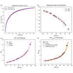We first validated the accuracy of RIC method using ammonium sulfate as a standard reference particle. As shown in Fig. 2a, the apparent molar volume as a function of ionic strength provides the basis for calculating the particle density. For a representative ammonium sulfate particle, we measured the radius and refractive index across 65 % RH–95 % RH and obtained a constrained dry radius of 2.99 µm (±0.014 µm) using RIC method. Data at lower RH were not measured because particles shrink as RH decreases, eventually becoming too small (approximately 3–4 µm) to be stably captured by the optical tweezers. Figure 2b compares the measured refractive indices with those calculated using the constrained optimal solute mass, showing a maximum deviation of less than 0.002. Additionally, the error bars for the optical tweezers measurements represent the standard deviation, obtained either directly from the statistics of measurements or calculated through error propagation. Figure 2c presents the GF of ammonium sulfate, together with a fit using Eq. (5):
