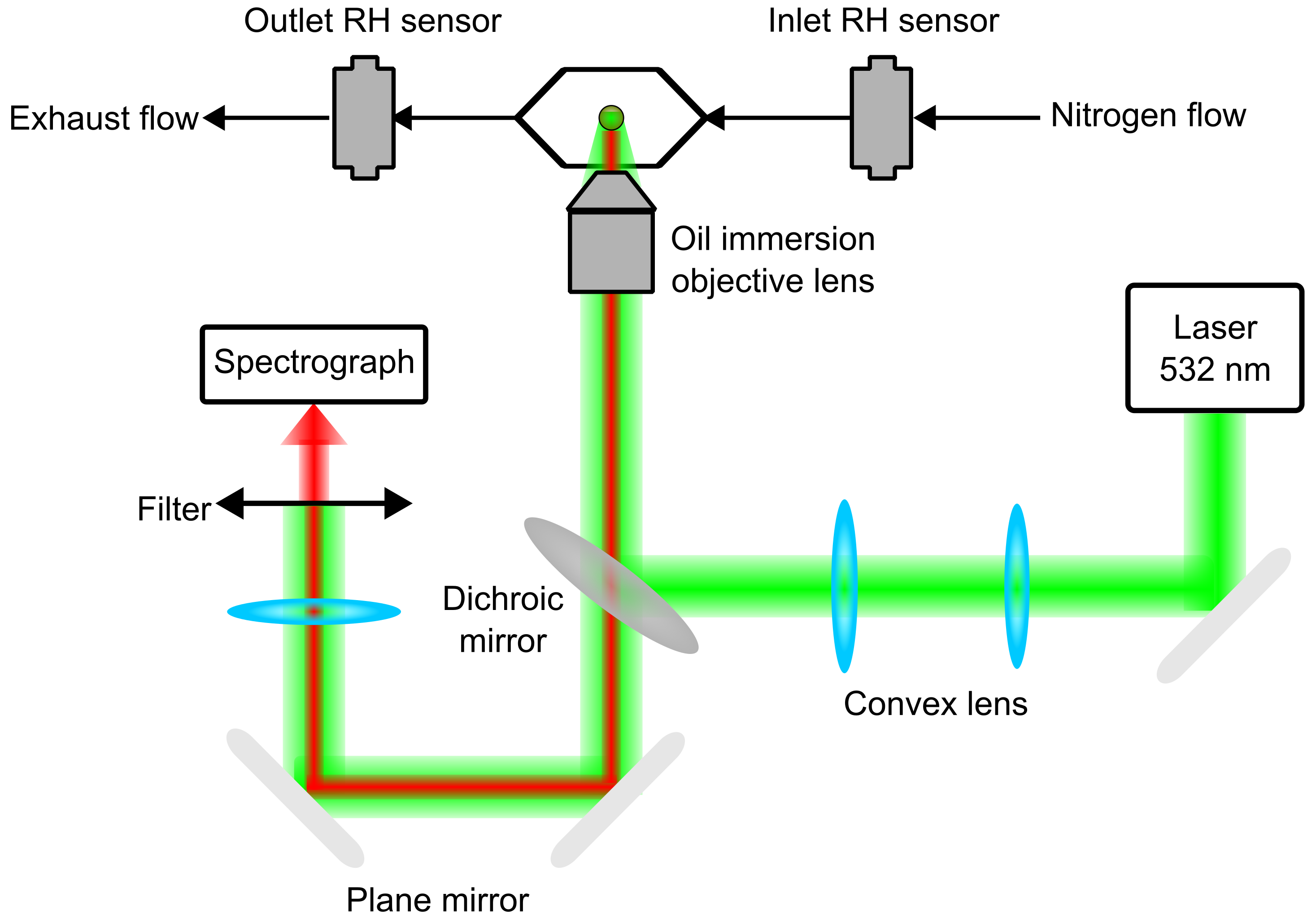 The aerosol optical tweezers system used in this study has been described previously (Fan et al., 2025; Qiu et al., 2024), here we provide a brief summary. As shown in Fig. 1, a 200 mW Gaussian beam from a semiconductor laser (Laser Quantum, Opus-6000, 532 nm) was collimated, expanded, and focused through a high-numerical-aperture objective (Olympus UIS2 PlanC N, 100×, 1.25 N.A.). The tightly focused beam formed a stable optical potential well capable of trapping individual aerosol particles with diameters of 6–12 µm inside the sample cell. Smaller particles become unstable in the trap as the optical gradient force is too weak, causing them to escape from the trap. While stably levitated particles, the same trapping laser also served as the excitation source for Raman scattering. The scattered light was collected, passed through optical filters to remove the excitation beam, and directed into a spectrometer (Zolix Omni-300i, 1200 grooves mm−1 grating) for detection, enabling subsequent determination of particle size and refractive index.