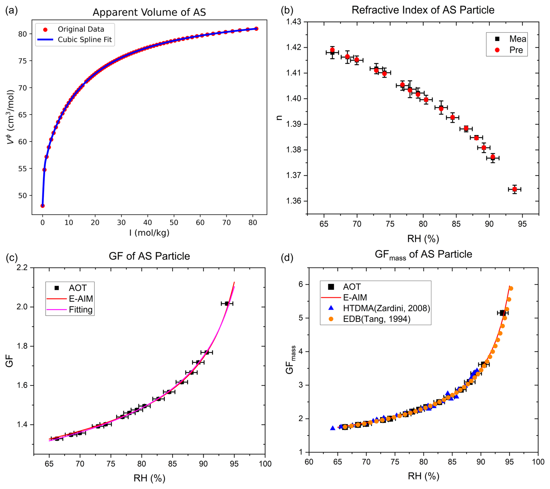 Figure 2Measurement of ammonium sulfate hygroscopicity. (a) Apparent molar volume of ammonium sulfate as a function of ionic strength. (b) Measured refractive index and corresponding values derived from the constrained solute mass. The error bars for the optical tweezers measurements represent the standard deviation. (c) Hygroscopic growth factors of ammonium sulfate particles, together with the fitted growth curve and the E-AIM prediction. AOT means data from aerosol optical tweezers and the standard deviation for growth factors is sufficiently small that it is largely obscured by the data markers. (d) Mass growth factor of ammonium sulfate compared with E-AIM predictions, HTDMA measurements (Zardini et al., 2008), and EDB measurements (Tang and Munkelwitz, 1994).