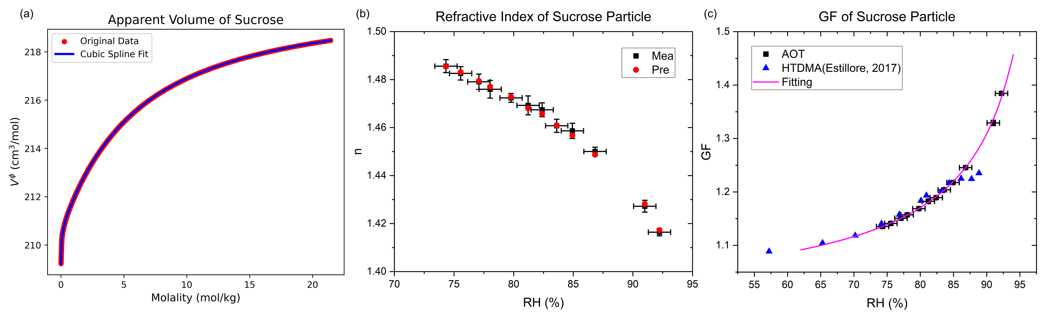 Figure 3Measurement of sucrose hygroscopicity. (a) Apparent molar volume of sucrose as a function of molality. (b) Measured refractive index and corresponding values derived from the constrained solute mass. (c) Hygroscopic growth factor of sucrose with fitted growth curve and HTDMA measurements (Estillore et al., 2017). AOT means data from aerosol optical tweezers.