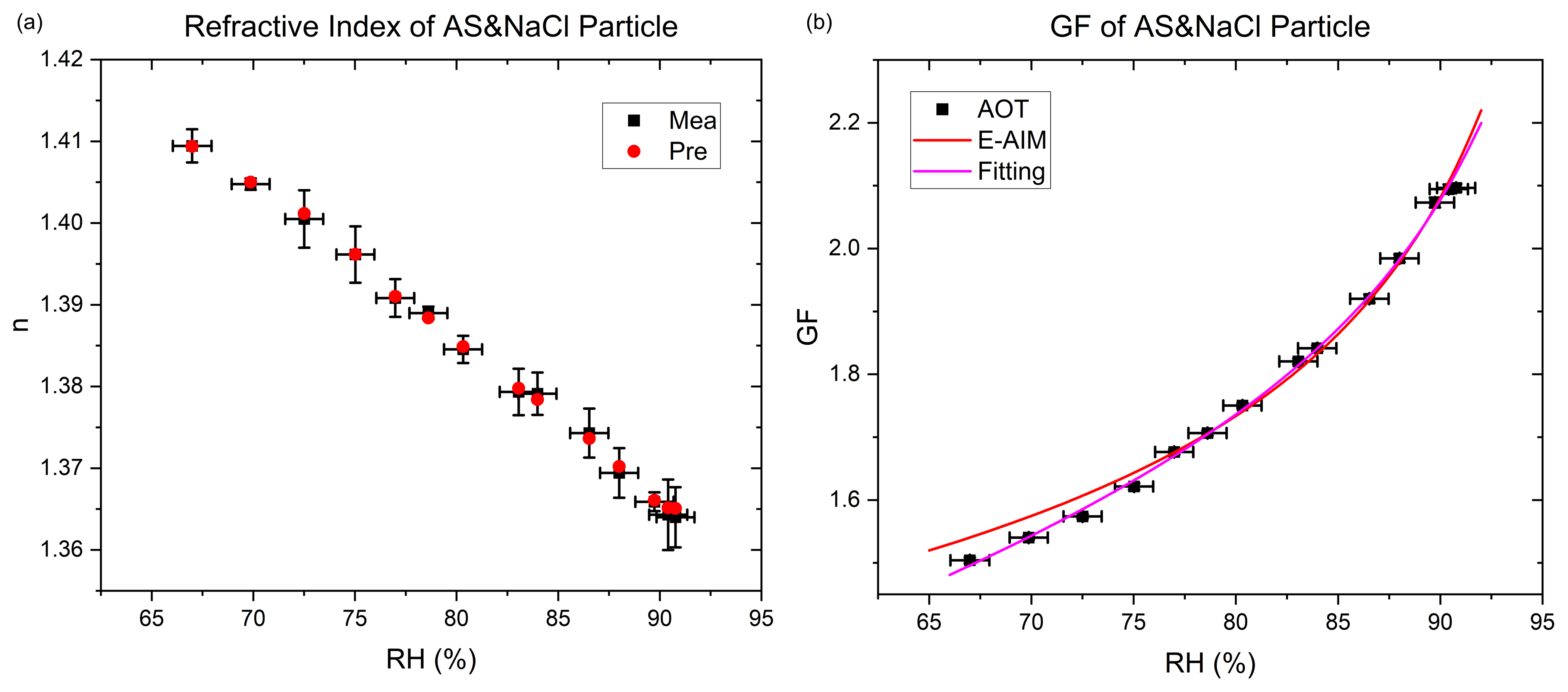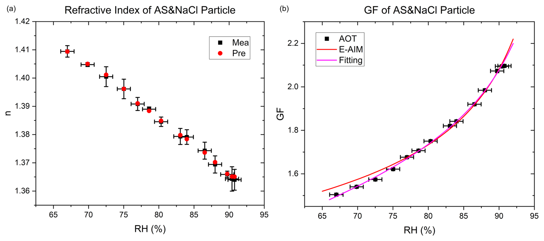 Figure 4Measurement of mixed ammonium sulfate–sodium chloride particles hygroscopicity. (a) Measured refractive index and corresponding values derived from the constrained solute mass. (b) Hygroscopic growth factor of mixed particles compared with E-AIM predictions. AOT means data from aerosol optical tweezers.