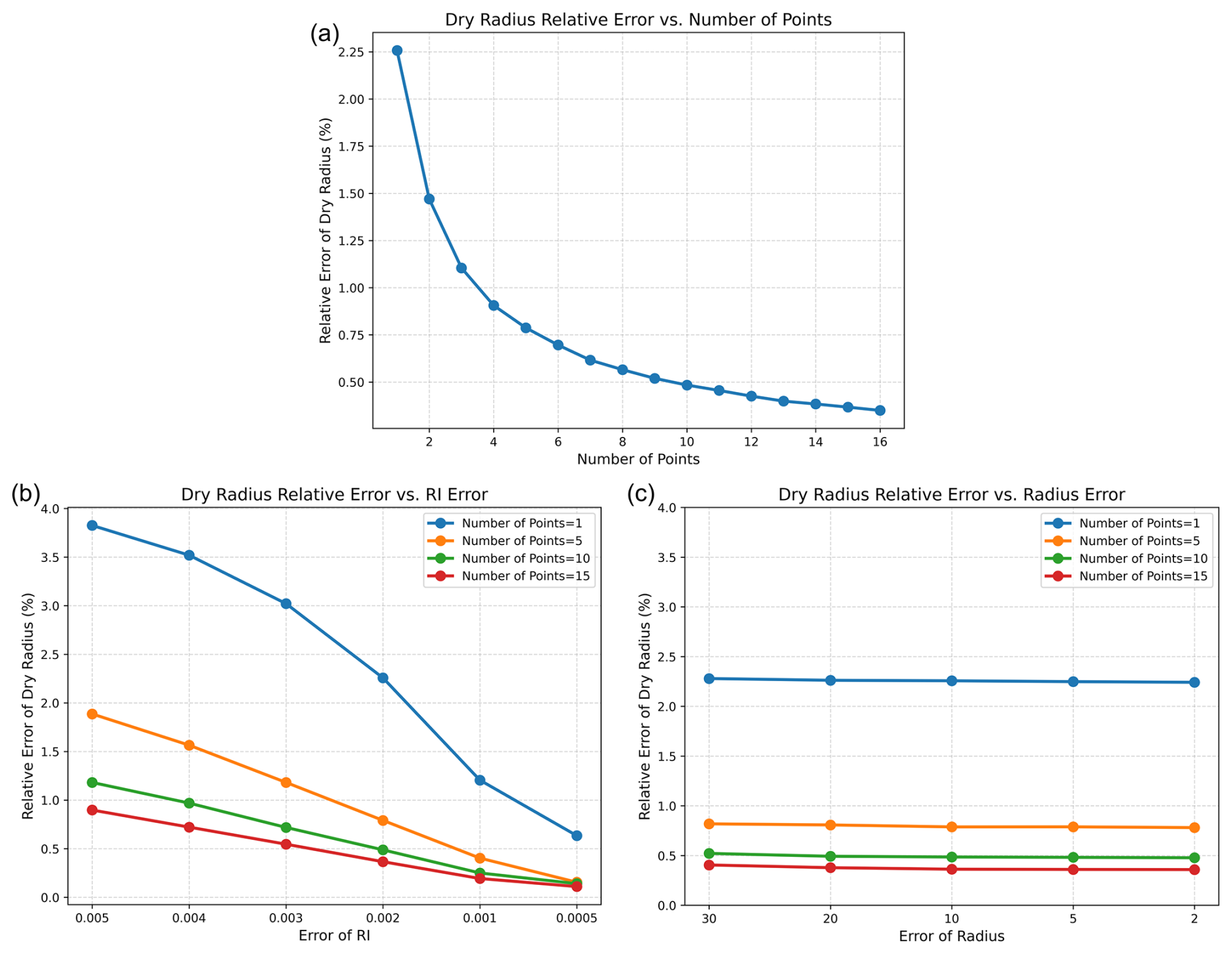 Figure 5Error analysis of the RIC method. (a) Relative error of the dry radius as a function of the number of measurement points, with refractive index and radius errors fixed at 0.002 and 10 nm, respectively. (b) Relative error of the dry radius as a function of refractive index error for different numbers of measurement points, with radius error fixed at 10 nm. (c) Relative error of the dry radius as a function of radius error for different numbers of measurement points, with refractive index error fixed at 0.002.