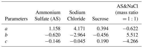 In this study, refractive index data of single-solute solutions at different solute mass fractions reported in the literature were taken as reference values (Tan and Huang, 2015; Urréjola et al., 2010; USDA, 2025). Assuming the molar refraction of a solute to be R0, we used the functional relation between apparent molar volume and solute concentration together with the molar refraction method to calculate the refractive index at different solute mass fractions. As shown in Fig. S3, by constraining R0 to minimize the total squared errors between calculated and reference values, we determined the molar refractions of individual solutes: 9.33 for NaCl, 23.52 for (NH4)2SO4, and 70.22 for sucrose. For water, the molar refraction was calculated using Eq. (1), yielding 3.71.