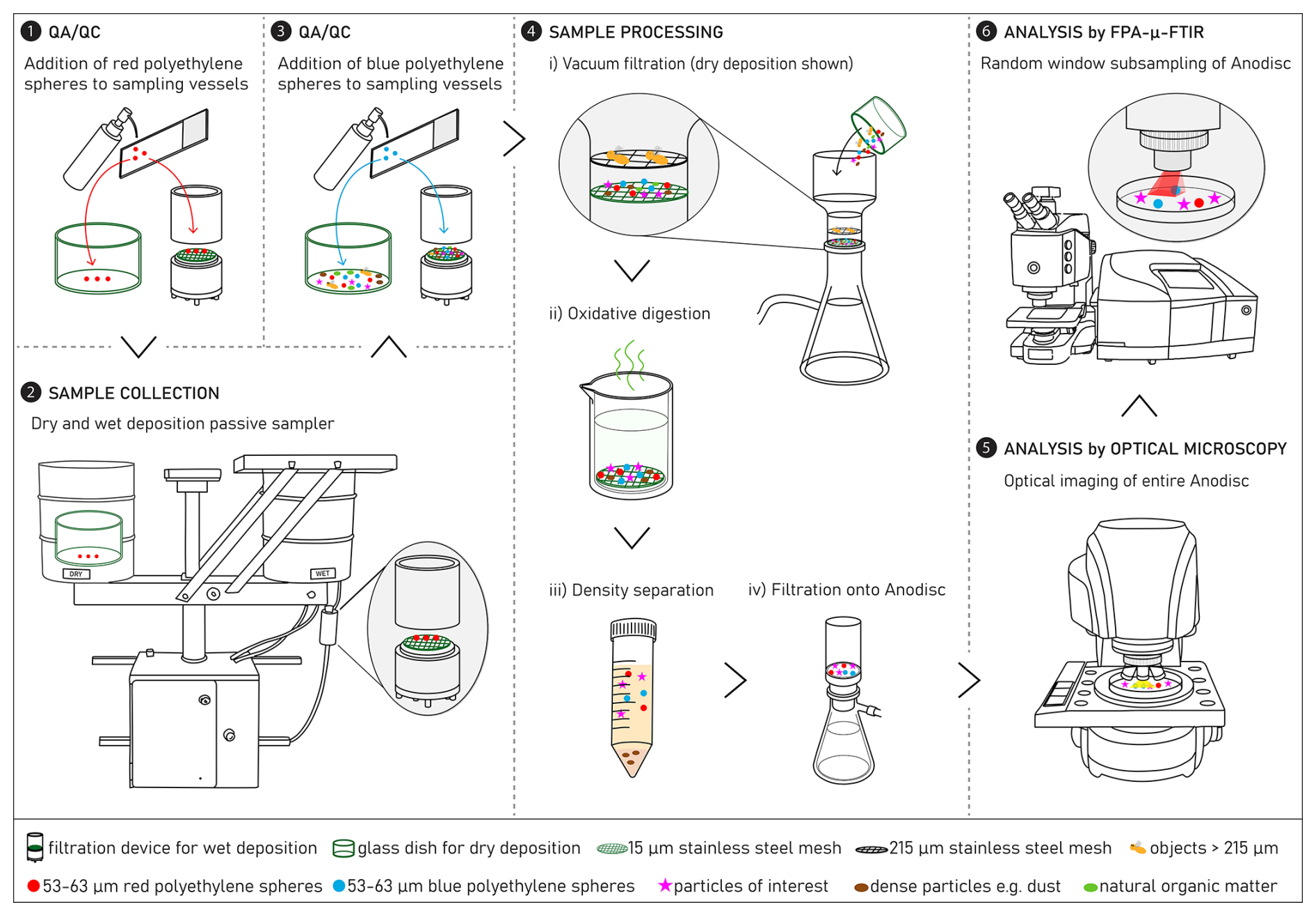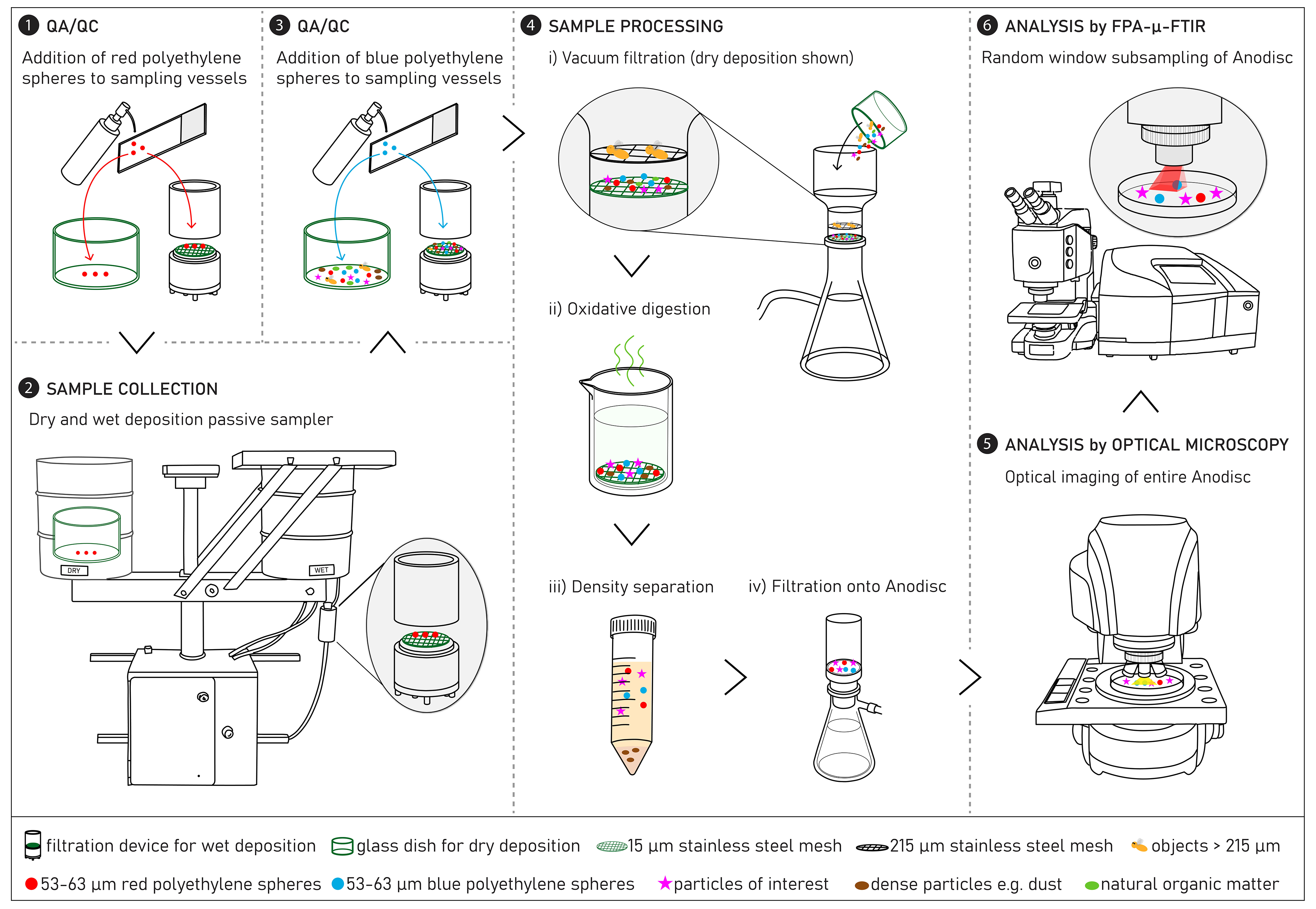 Figure 1A tailored analytical chain for the quantification of microplastics (MPs) in wet and dry atmospheric deposition samples. The analytical chain includes sample collection (2), processing (4) and analysis by optical microscopy and focal plane array μ-Fourier transform infrared spectroscopy (FPA-μ-FTIR) (5, 6), as well as quality assurance/quality control (QA/QC) (1, 3) using surrogate microplastic standards (red and blue polyethylene spheres, ∅ 53–63 µm).