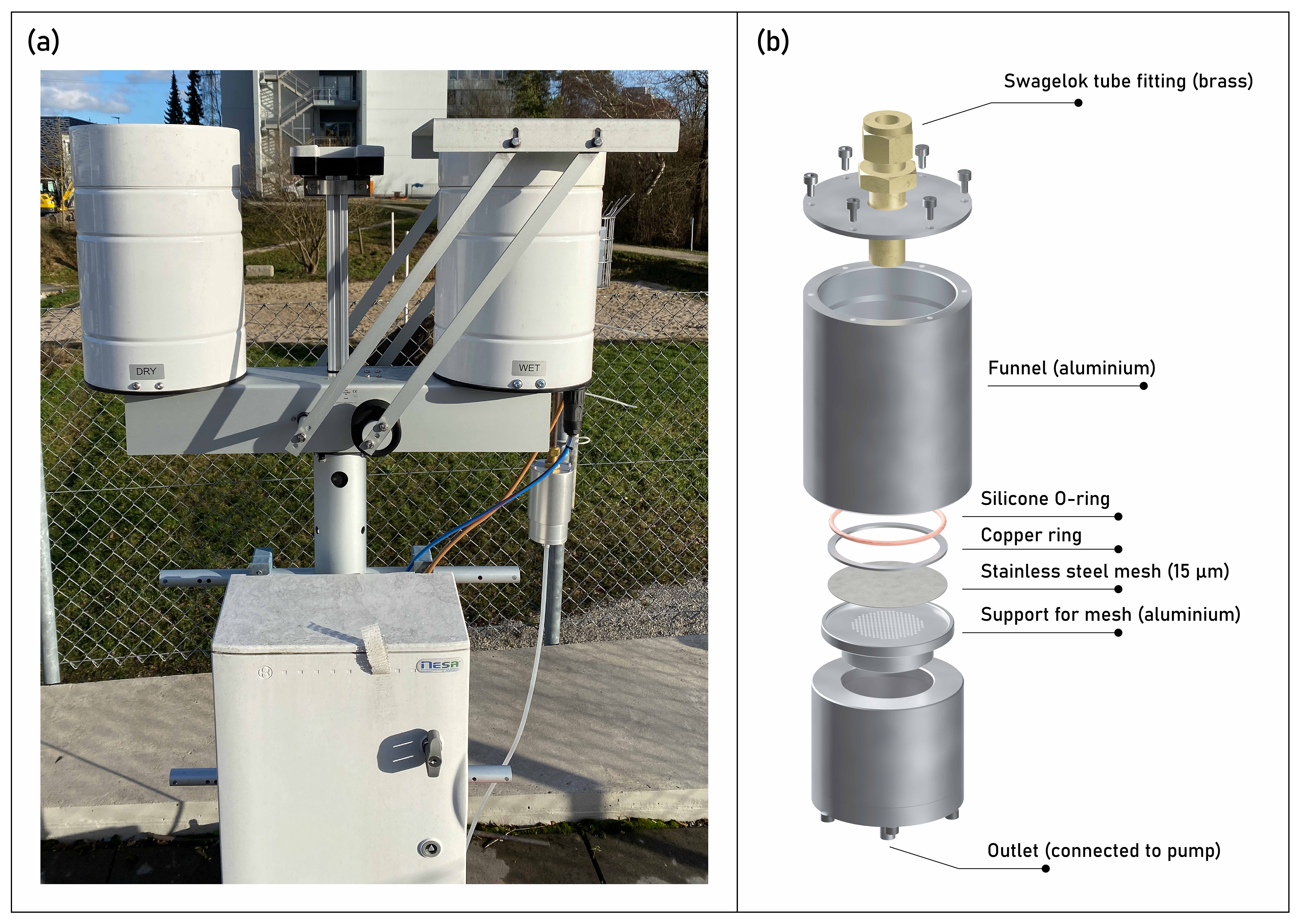 Figure 2Dry (left cylinder, ∅ 23 cm) and wet (right cylinder, ∅ 23 cm) deposition passive sampler (a). Dry deposition samples were collected in a glass dish (∅ 19 cm) containing a layer of glycerol placed in the cylinder. Wet deposition samples were collected using a custom-made on-site aluminium filtration device (b). The filtration device was fitted with a stainless-steel mesh (∅ 47 mm, 15 µm mesh size).